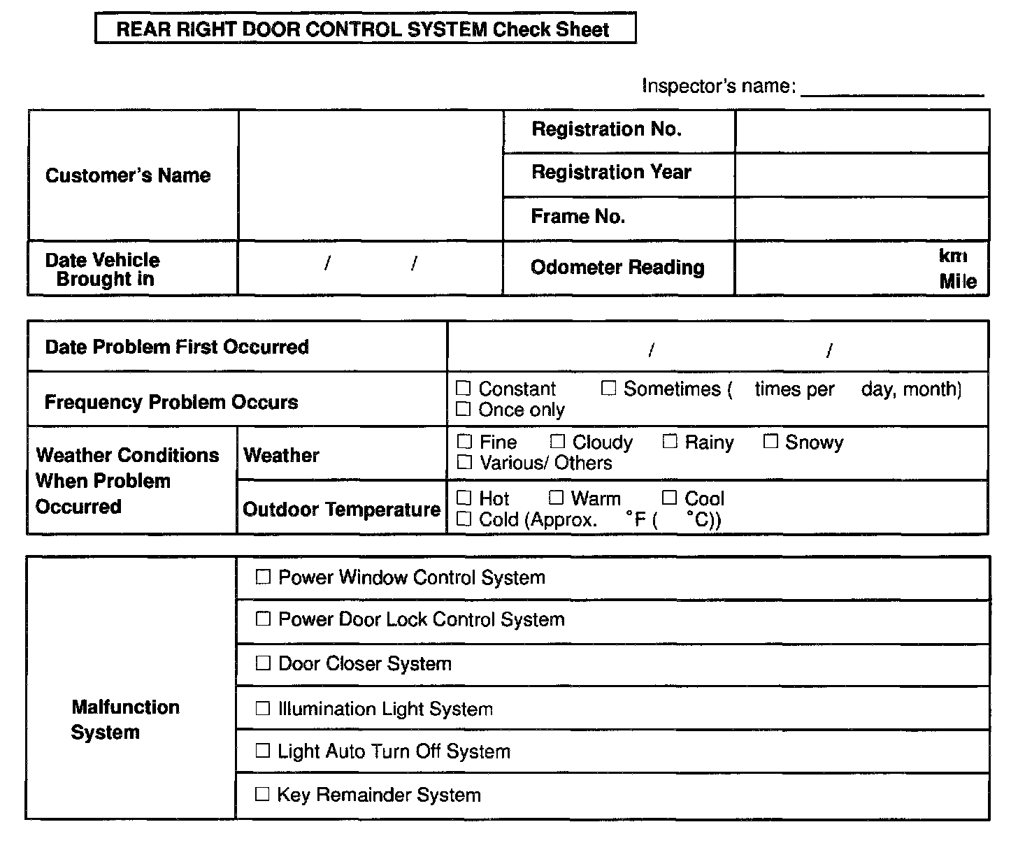 Rear Right Door Control System Check Sheet: