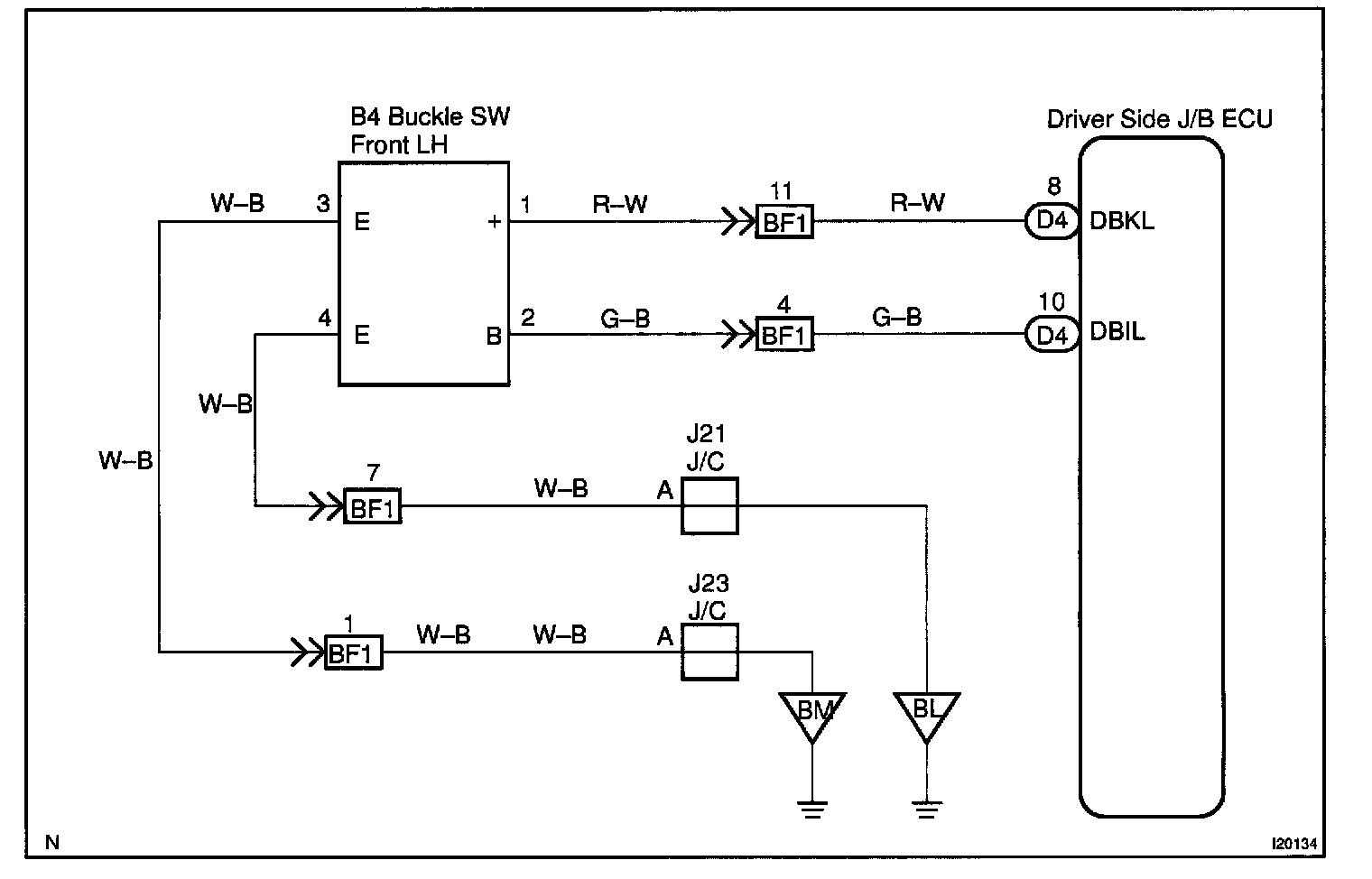 Receiving the courtesy signal from the door ECU, the Driver side J/B ECU makes the buckle illumination on the opened door side come on.