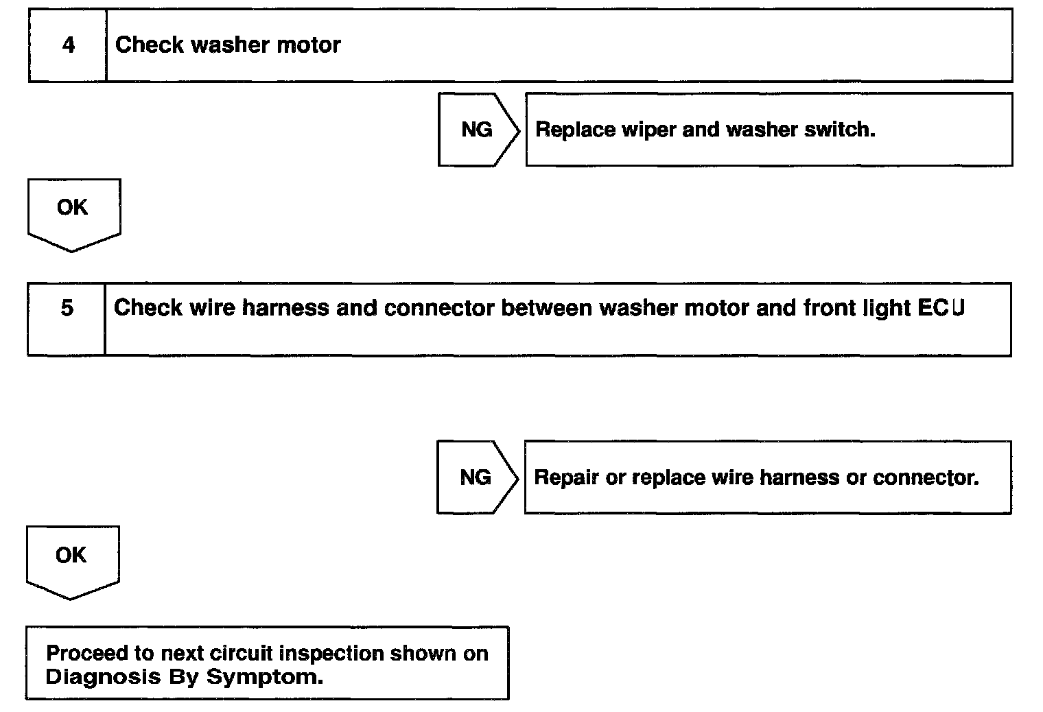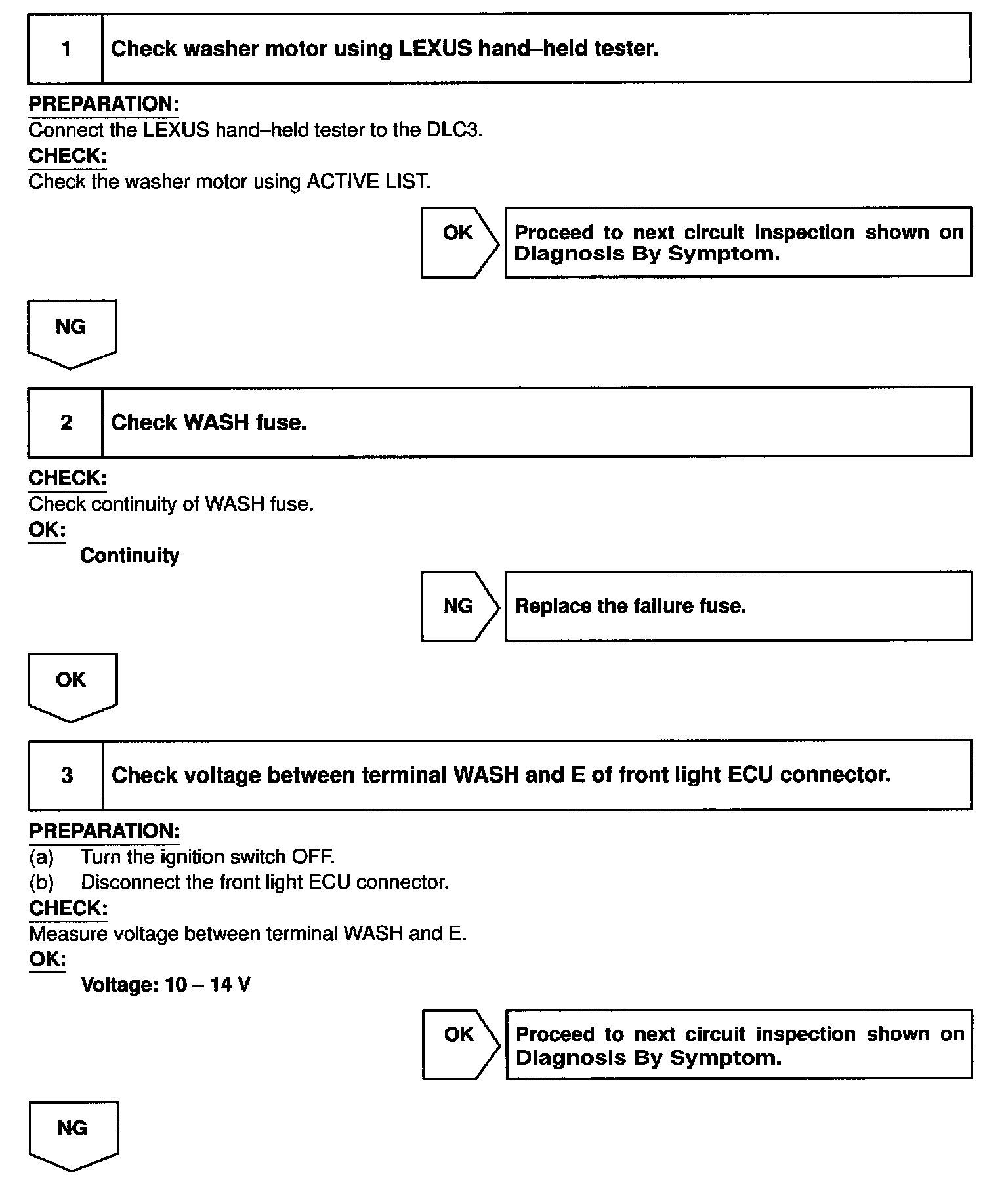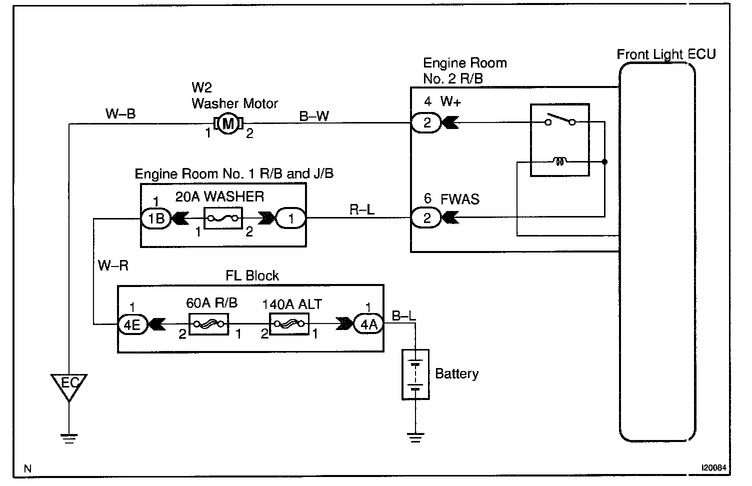 Front Light ECU receives washer switch information from the combination switch, and operates the washer motor.