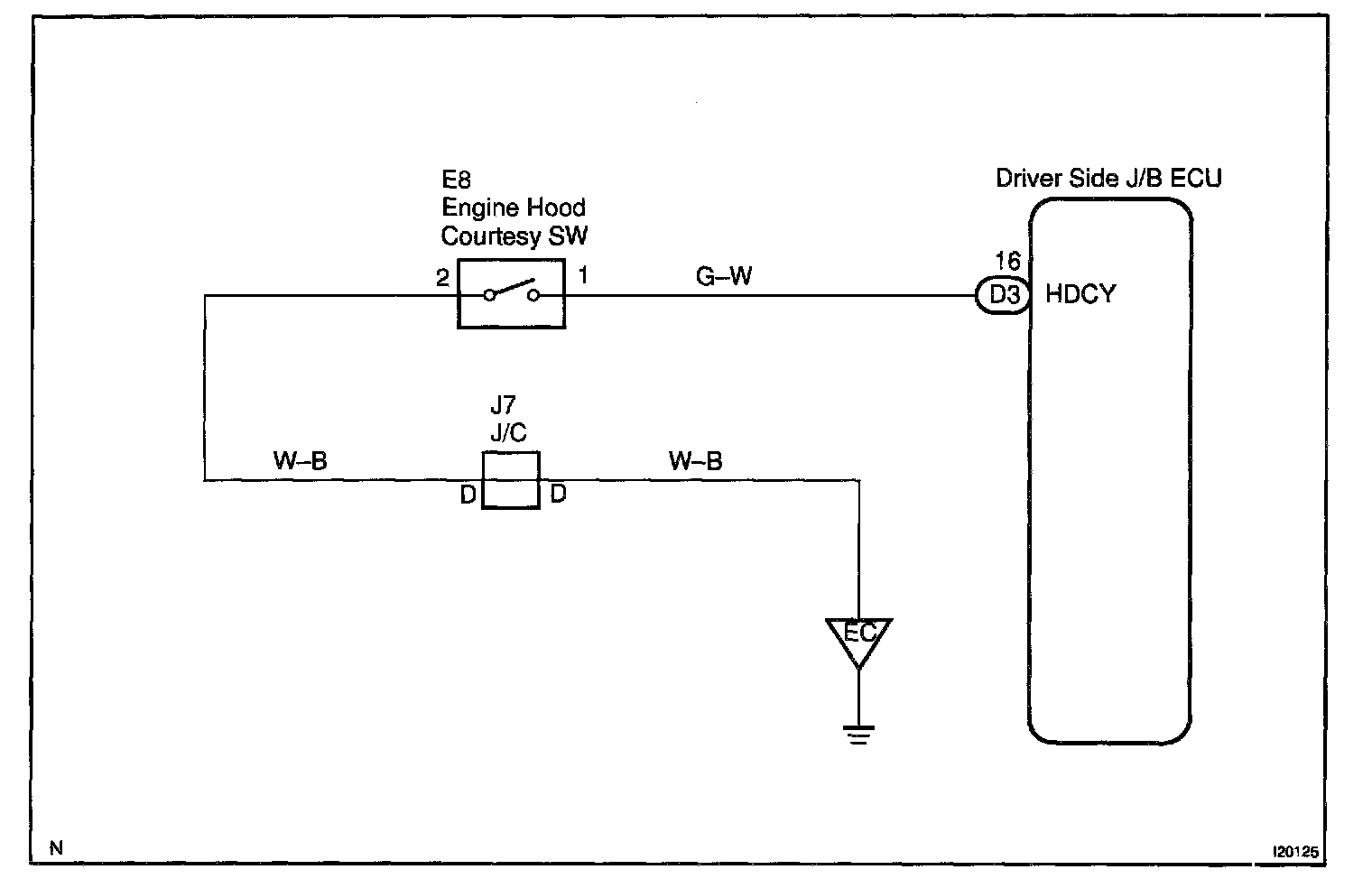 The engine hood courtesy SW signal is sent to the Driver Side J/B ECU, and through the multiplex communication circuit to the Theft Deterrent ECU.