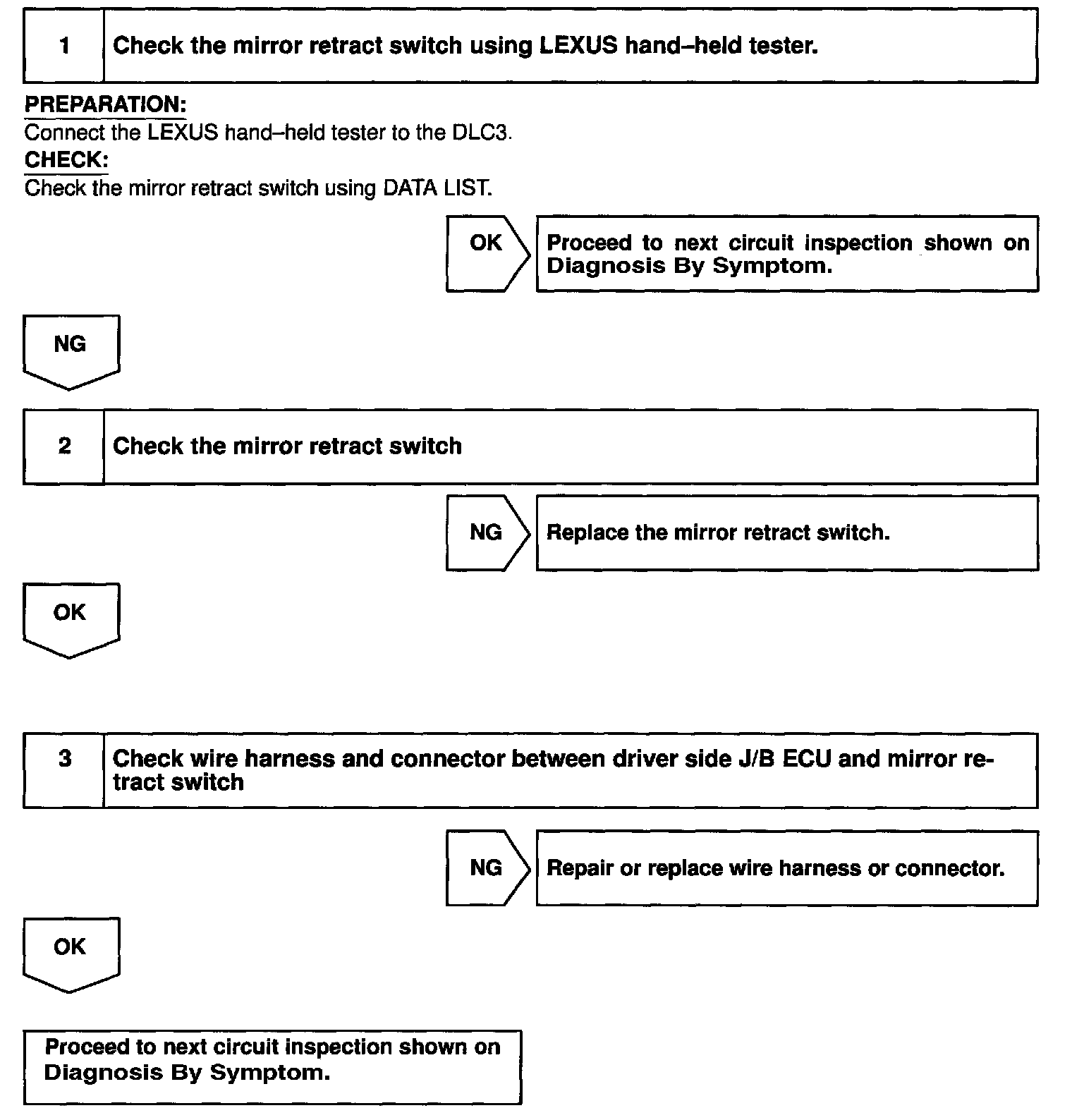 The operating condition of the mirror retract switch is input by the driver side J/B ECU and the input signals are sent to the driver door ECU or the passenger door ECU.