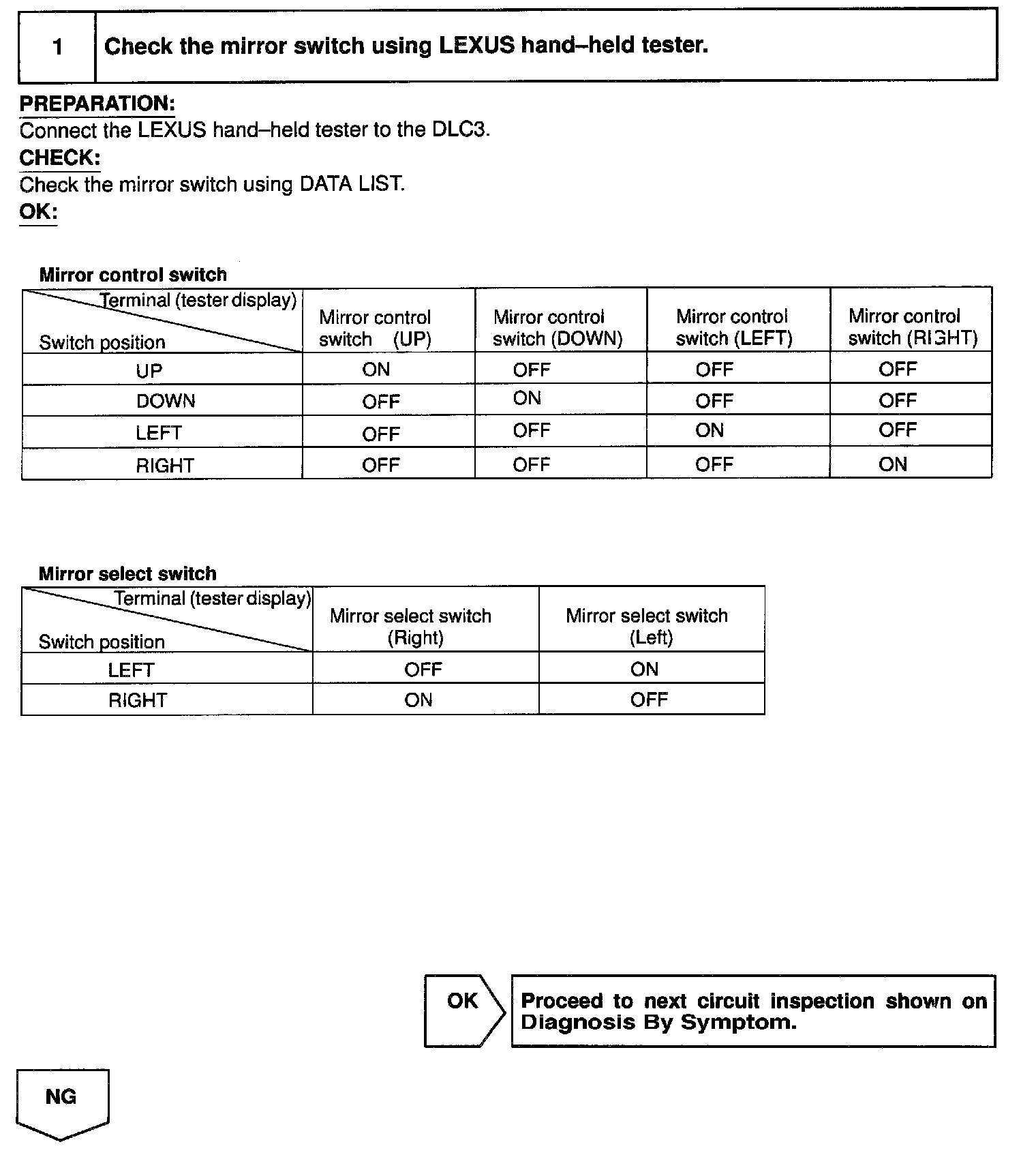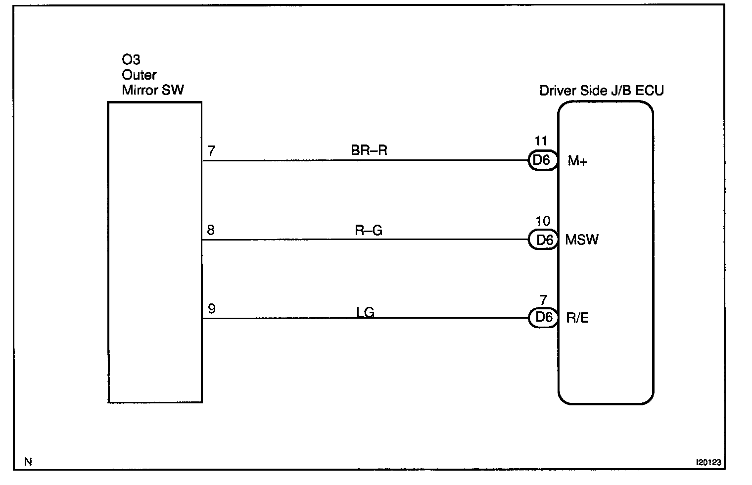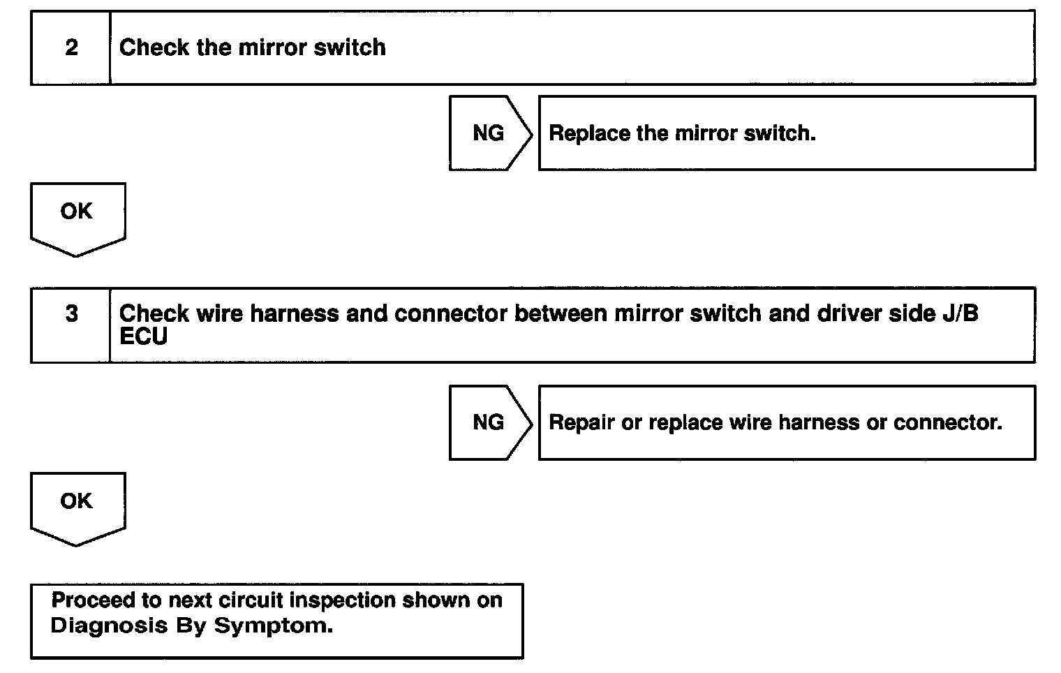 The operating condition of the mirror switch is input by the driver side J/B ECU and the input signals are sent to the driver door ECU or the passenger door ECU.