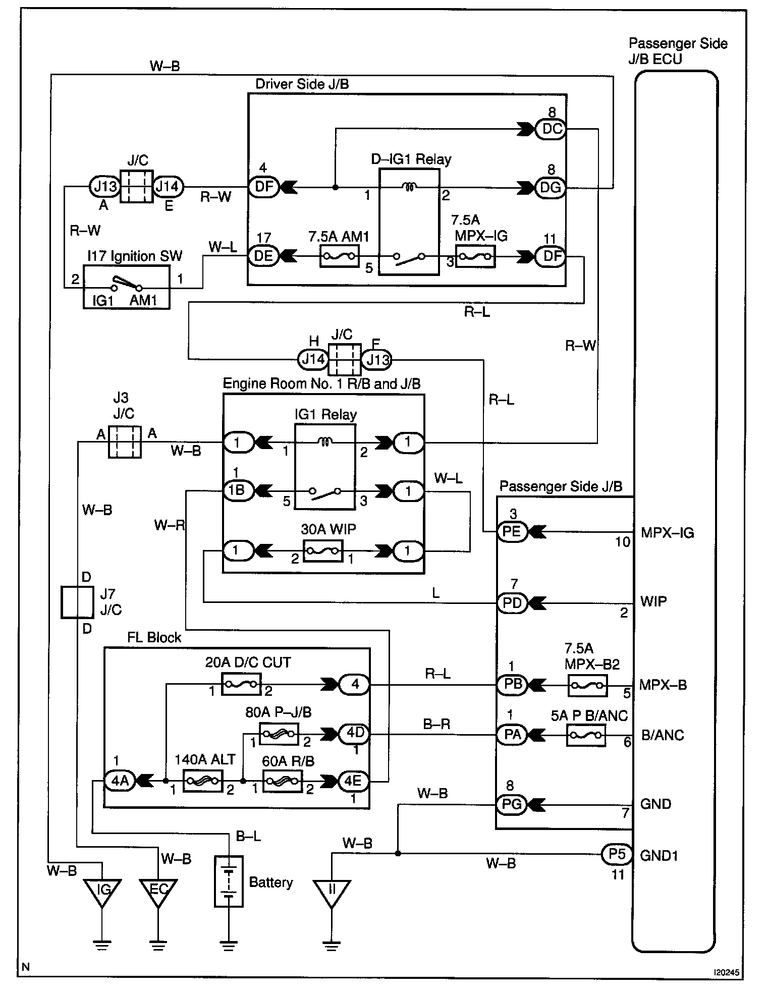 This circuit provides power to operate the passenger side J/B ECU.