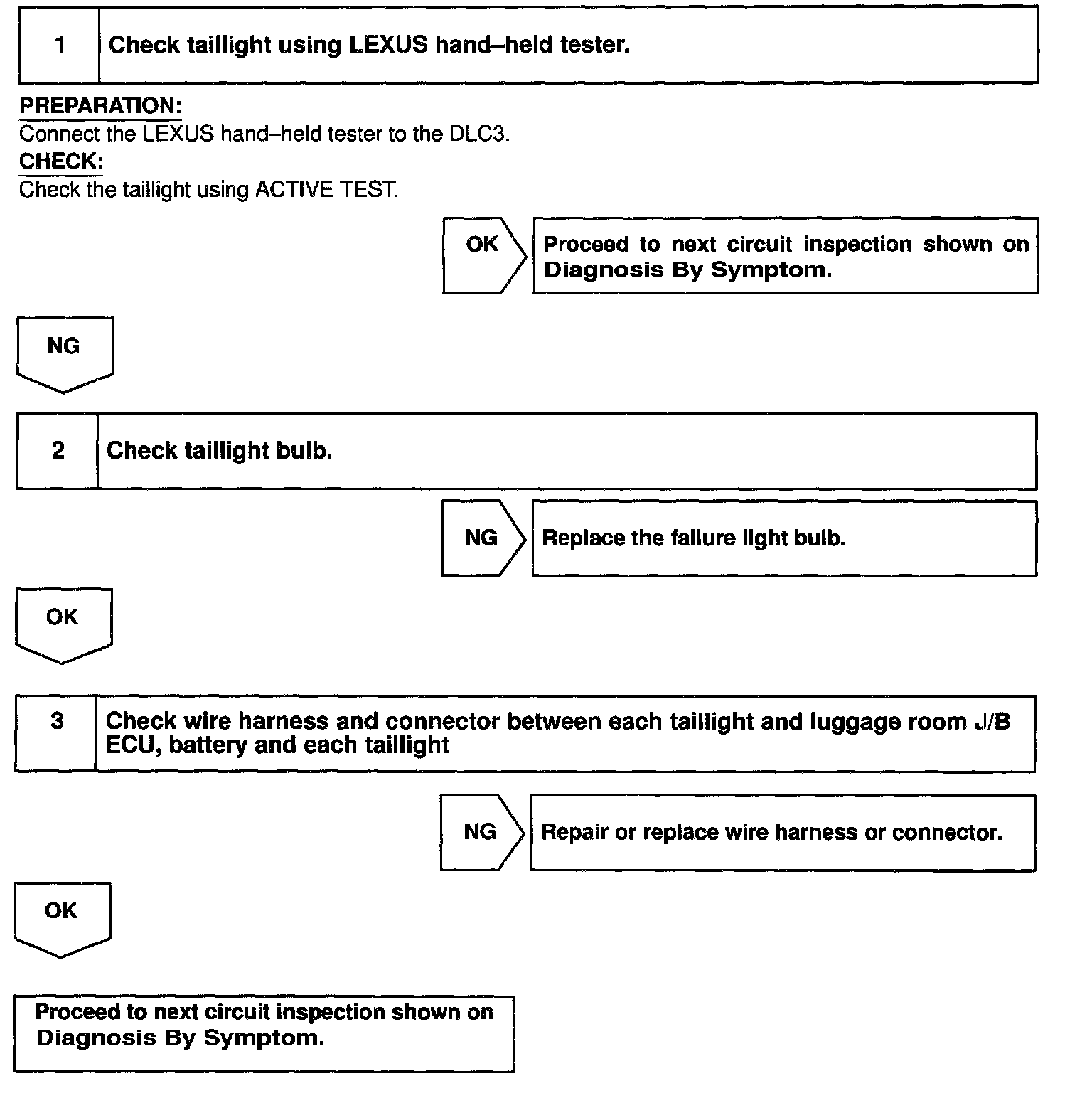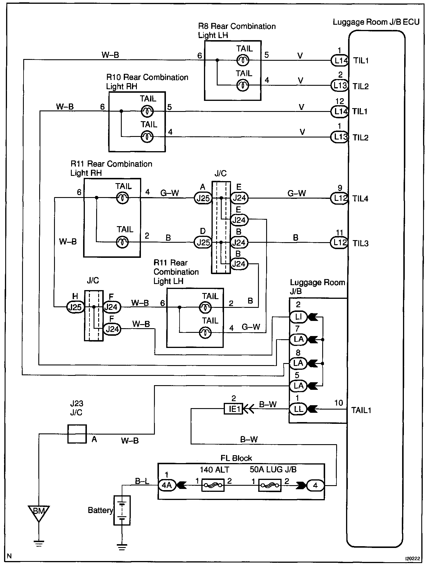 Receiving the light control switch TAIL signal from either of the luggage room J/B ECU makes the taillight come on.