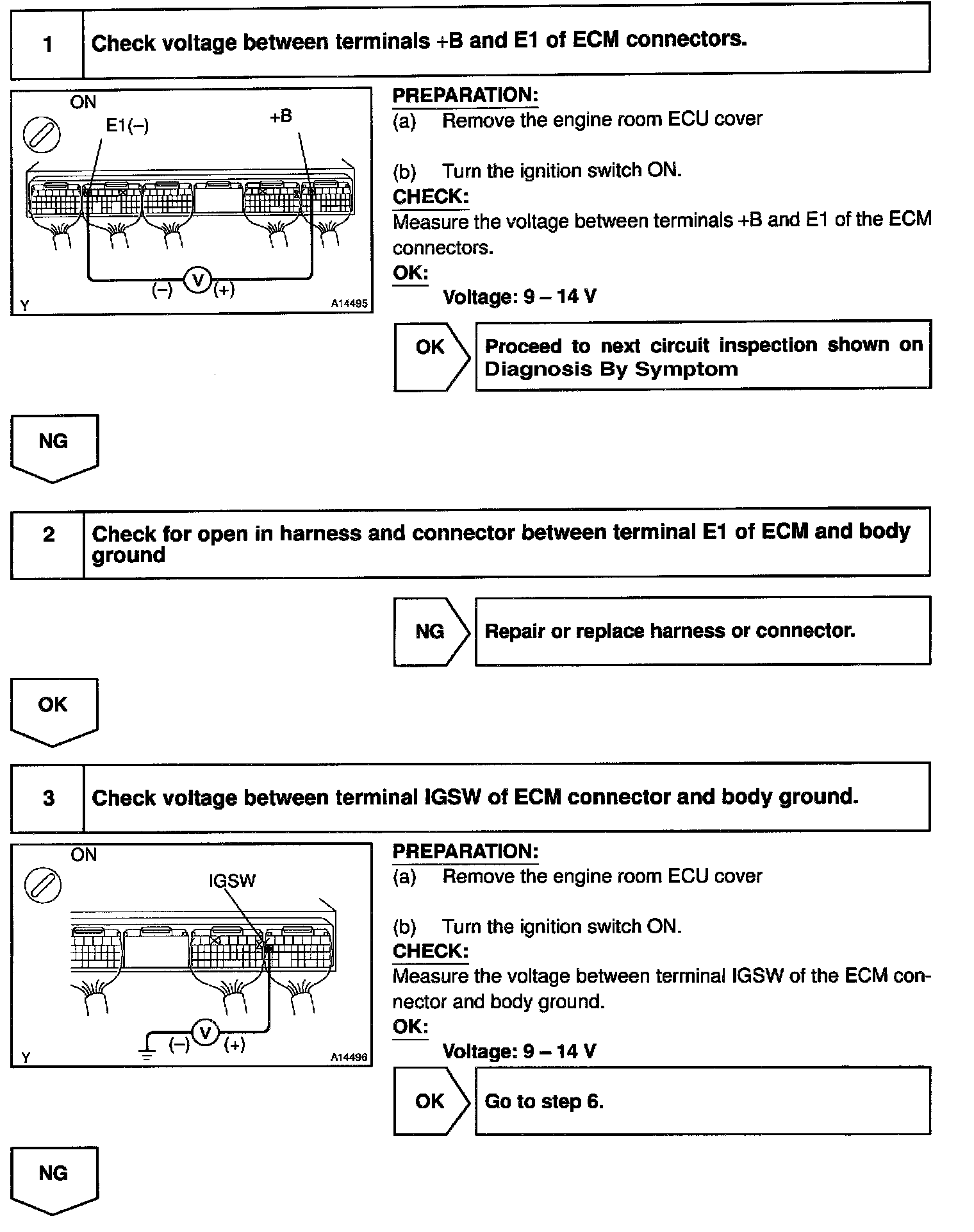 This signal causes current to flow to the coil, closing the contacts of the EFI main relay and supplying power to terminal +B of the ECM.