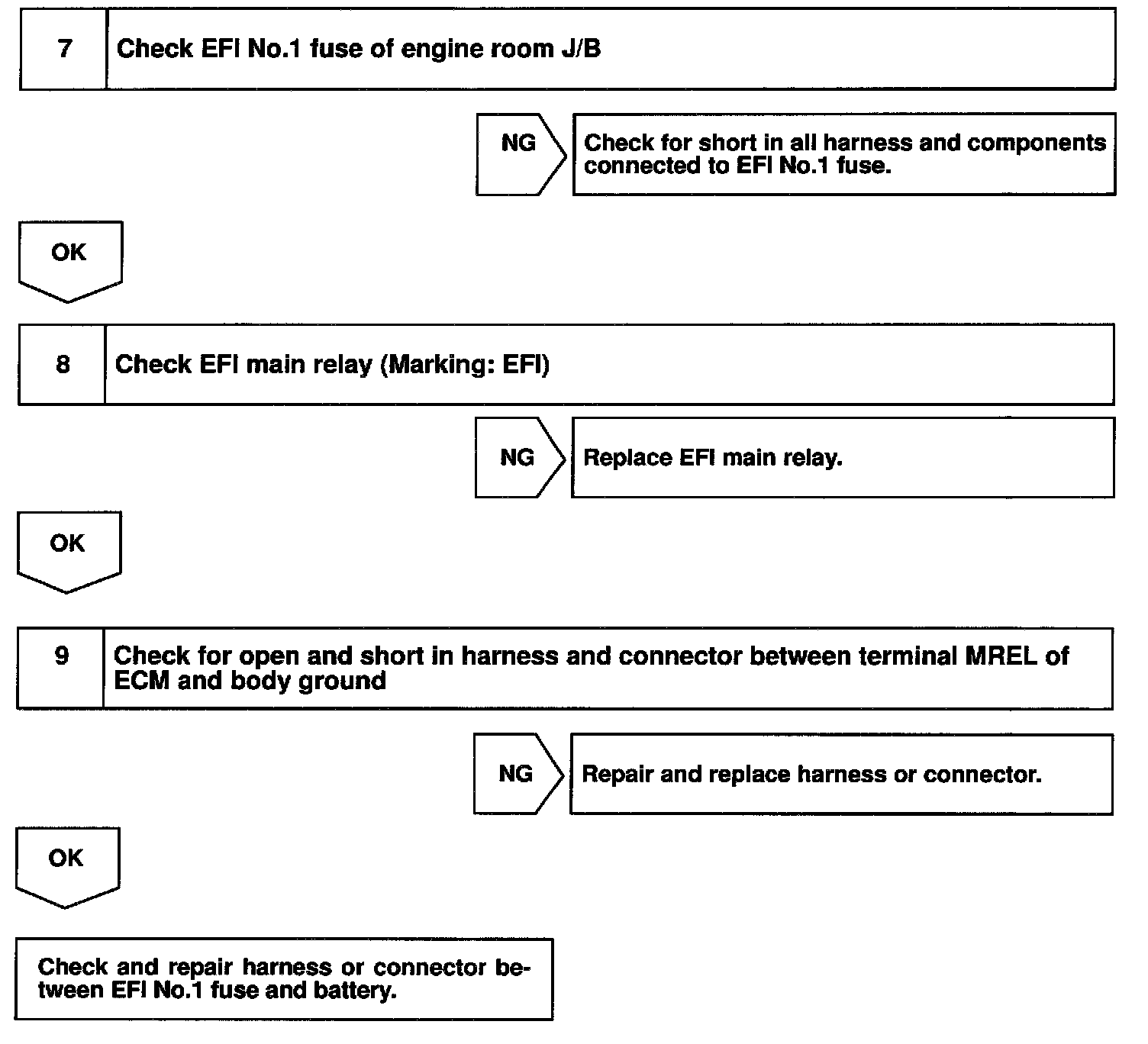 CIRCUIT DESCRIPTIONWhen the ignition switch is turned ON, battery positive voltage is applied to terminal IGSW of the ECM and the EFI main relay (Marking: EFI) control circuit in the ECM sends a signal to terminal MREL of the ECM switching on the EFI main relay.