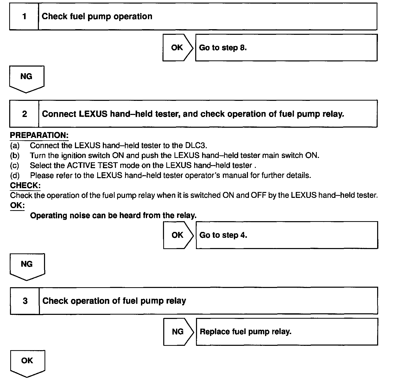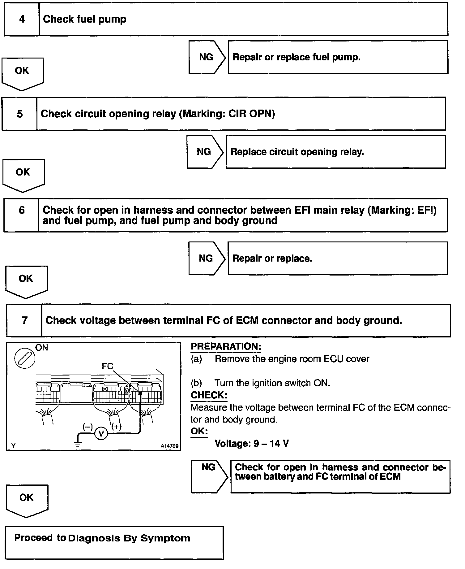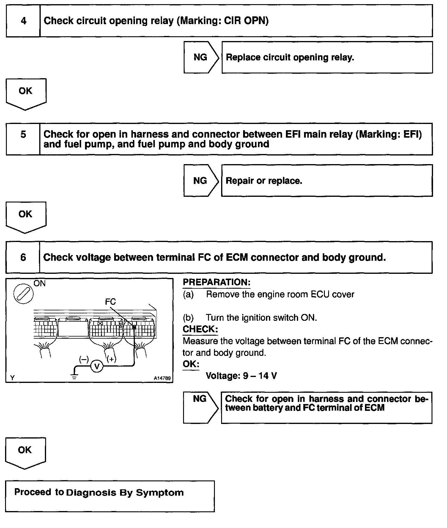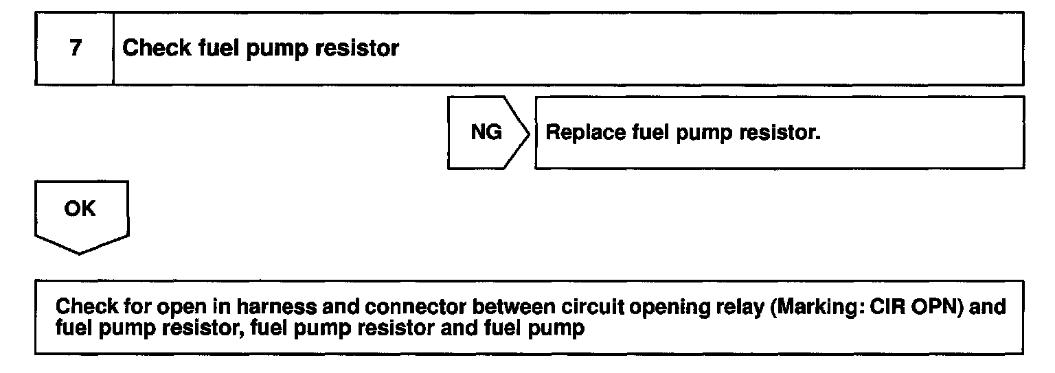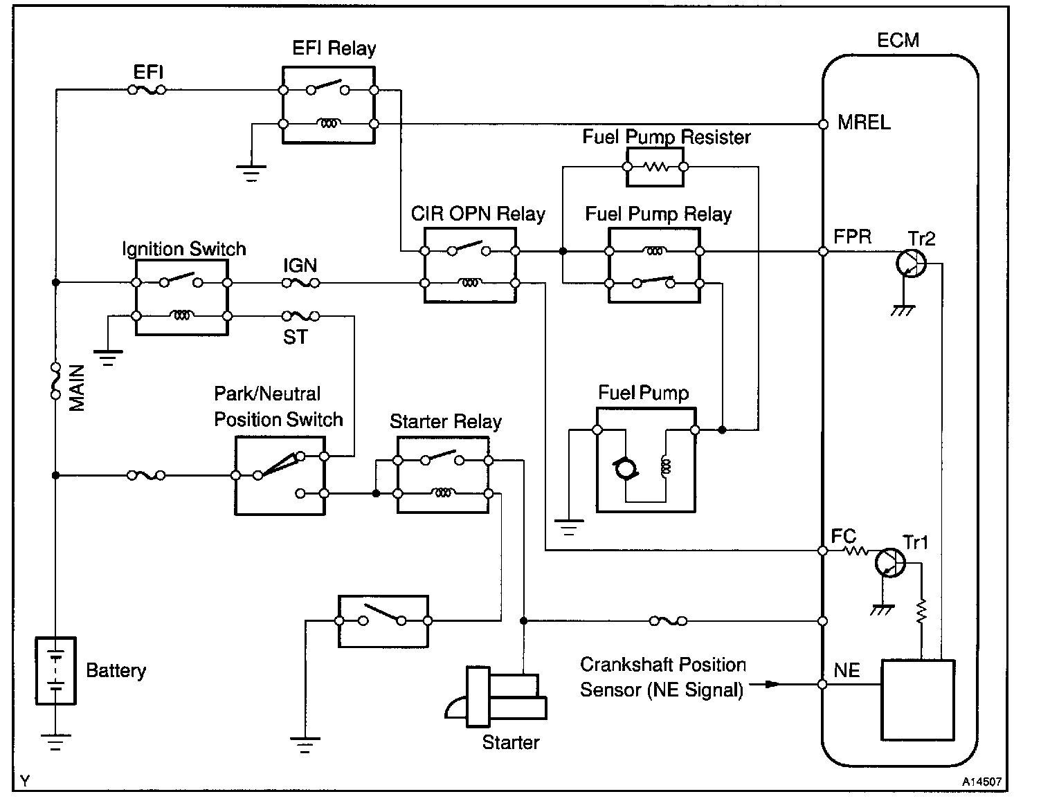 When the STA signal and NE signal are input to the ECM, Tr1 is turned ON, current flows to coil of the circuit opening relay, the relay switches on, power is supplied to the fuel pump and the fuel pump operates. While the NE signal is generated (engine running), the ECM keeps Tr1 ON (circuit opening relay ON) and the fuel pump also keeps operating.