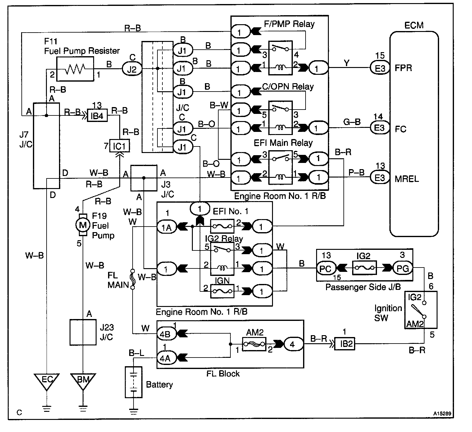 The fuel pump speed is controlled at two levels (high speed or low speed) by the condition of the engine (starting, light load, heavy load). When the engine starts (STA ON), Tr2 in the ECM is OFF, so the fuel pump relay closes and battery voltage is applied directly to the fuel pump. Fuel pump operates at high speed. After the engine starts during idling or light loads, since Tr2 goes ON, power is supplied to the fuel pump via the fuel pump resistor.