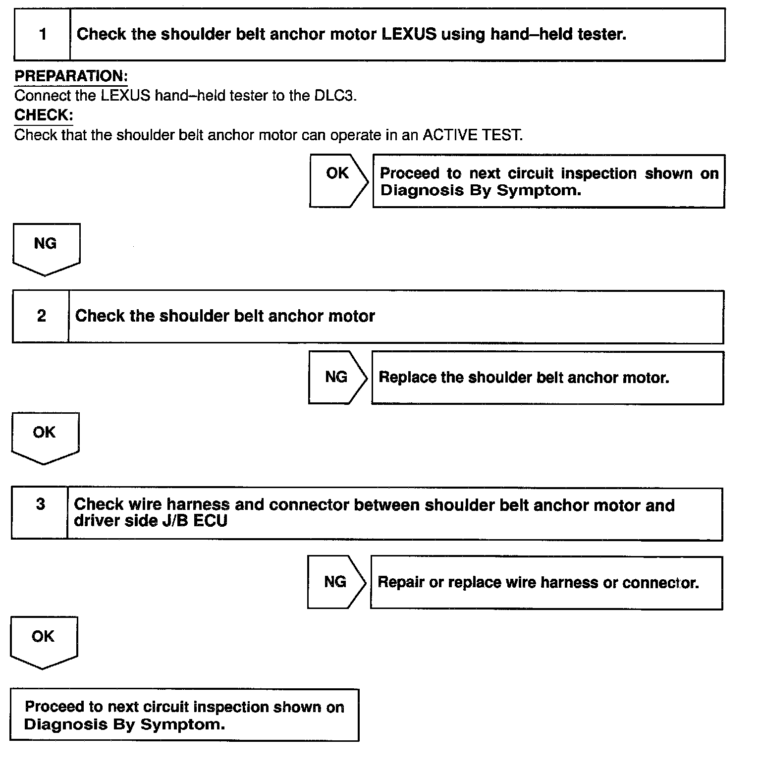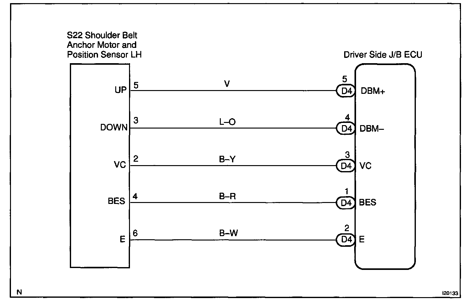 CIRCUIT DESCRIPTIONThe Driver side J/B ECU receives the seat belt anchor switch signal from the Driver Door ECU to operate the seat belt anchor motor.