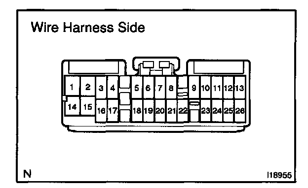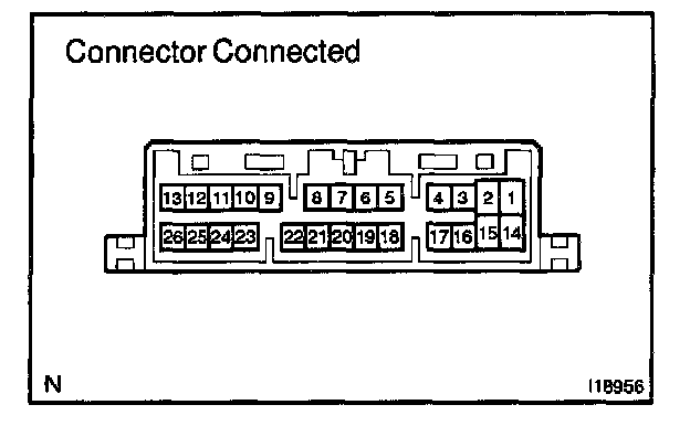 Disconnect the connector from the ECU and inspect the connector on the wire harness side, as shown.