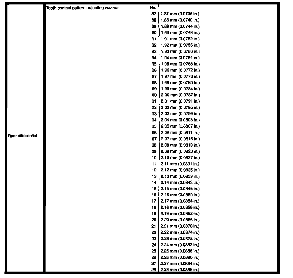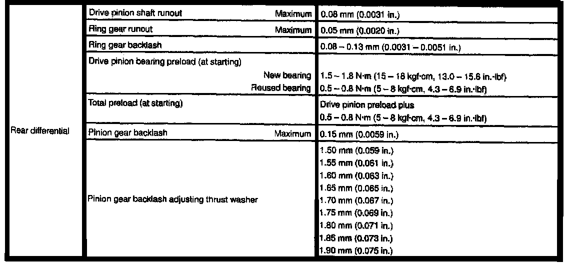 Rear Wheel Drive, Differential Clearances / Backlash: