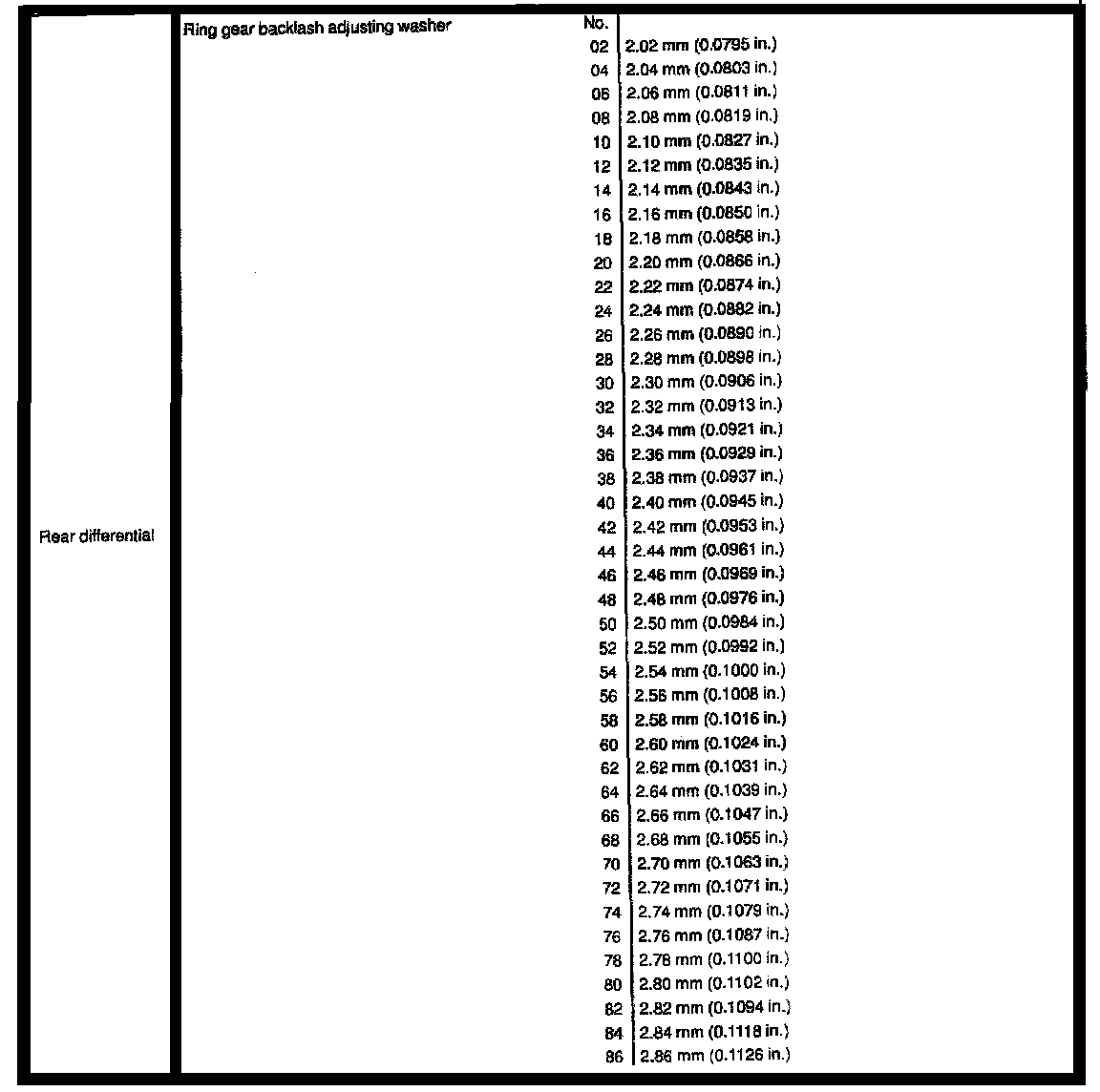 Rear Wheel Drive, Differential Ring Gear Backlash: