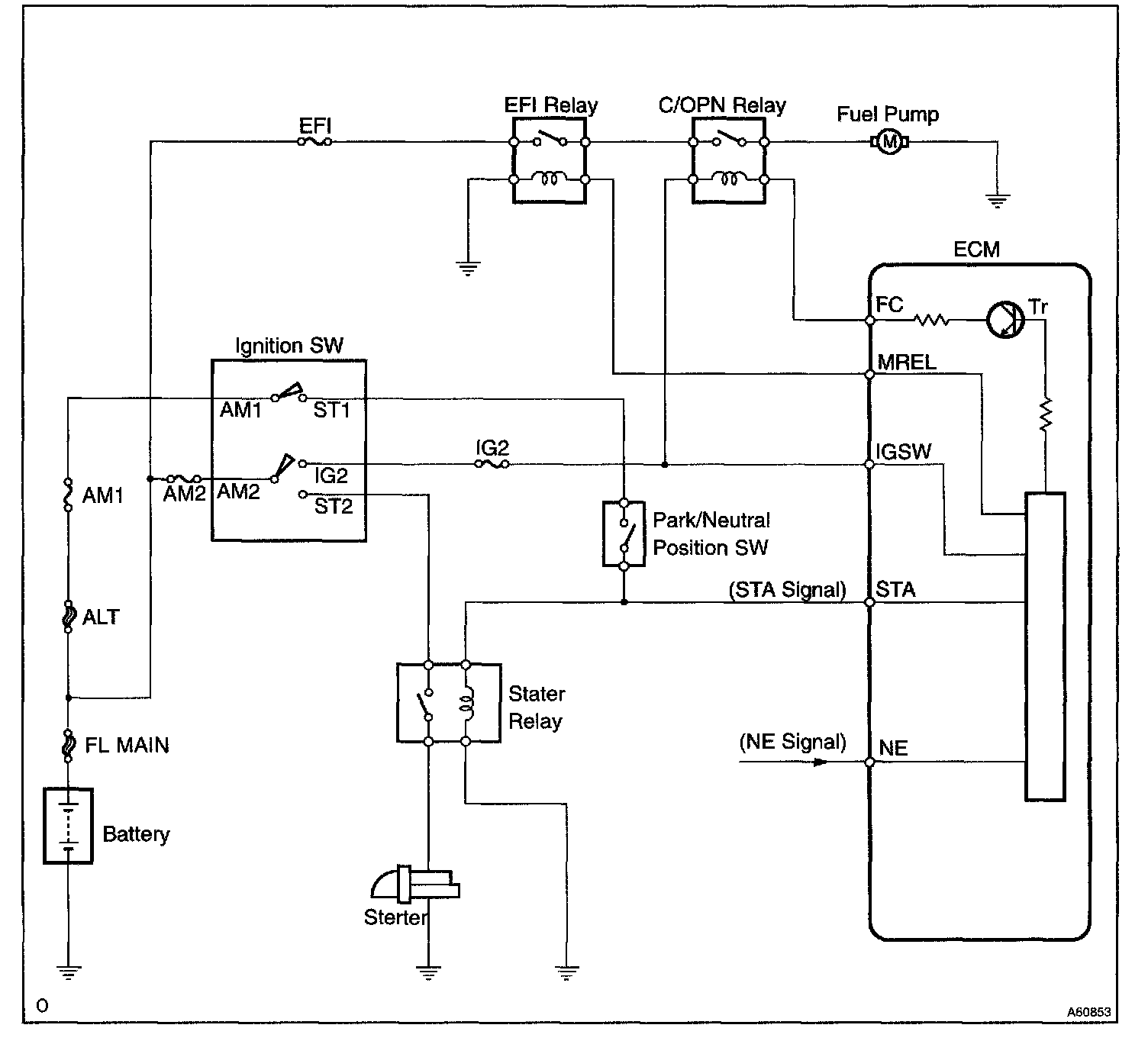 CIRCUIT DESCRIPTIONIn the diagram, when the engine is cranked, current flows from terminal ST of the ignition switch to the starter relay (Marking: ST) coil and also current flows to terminal STA of ECM (STA signal).