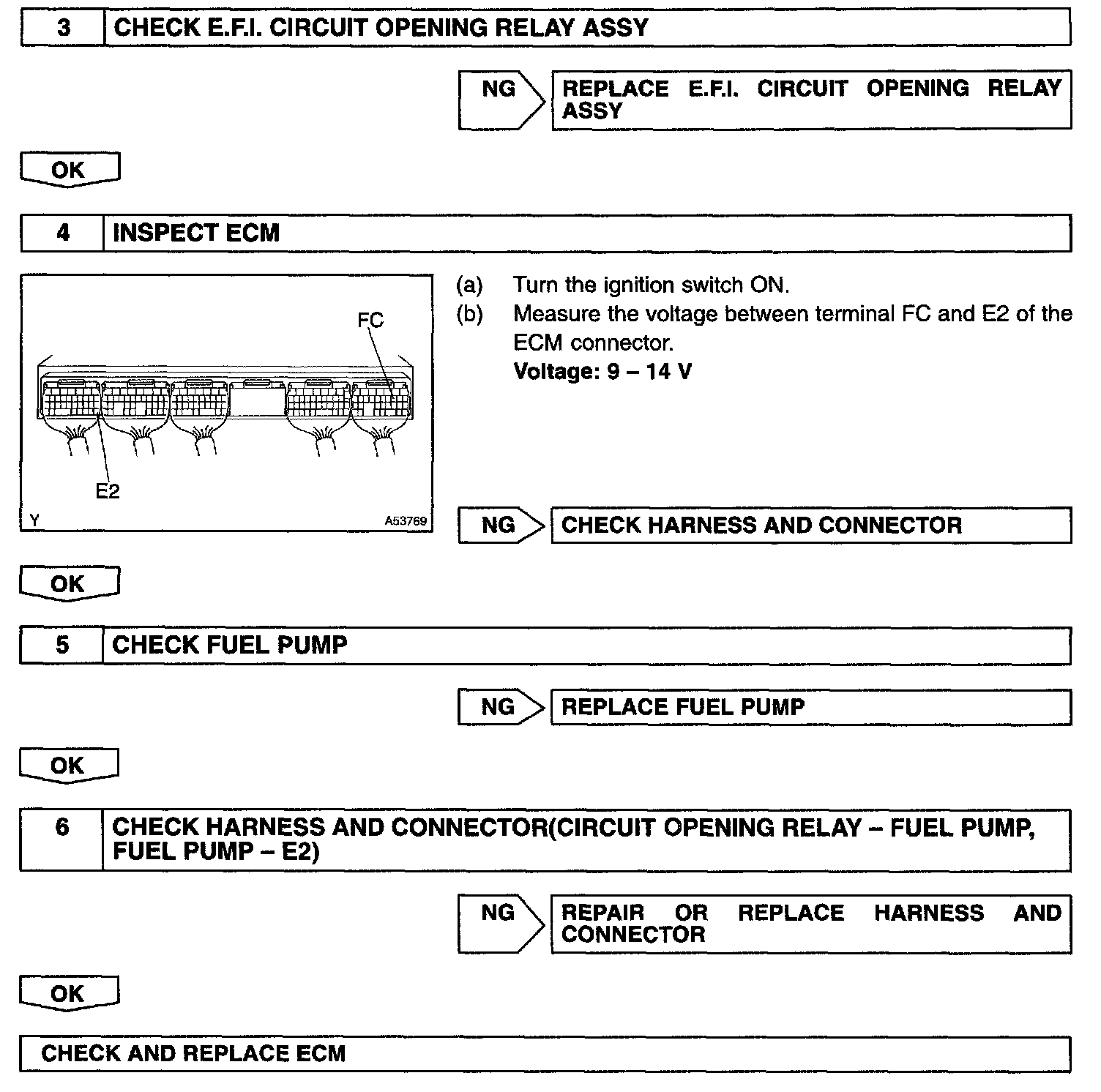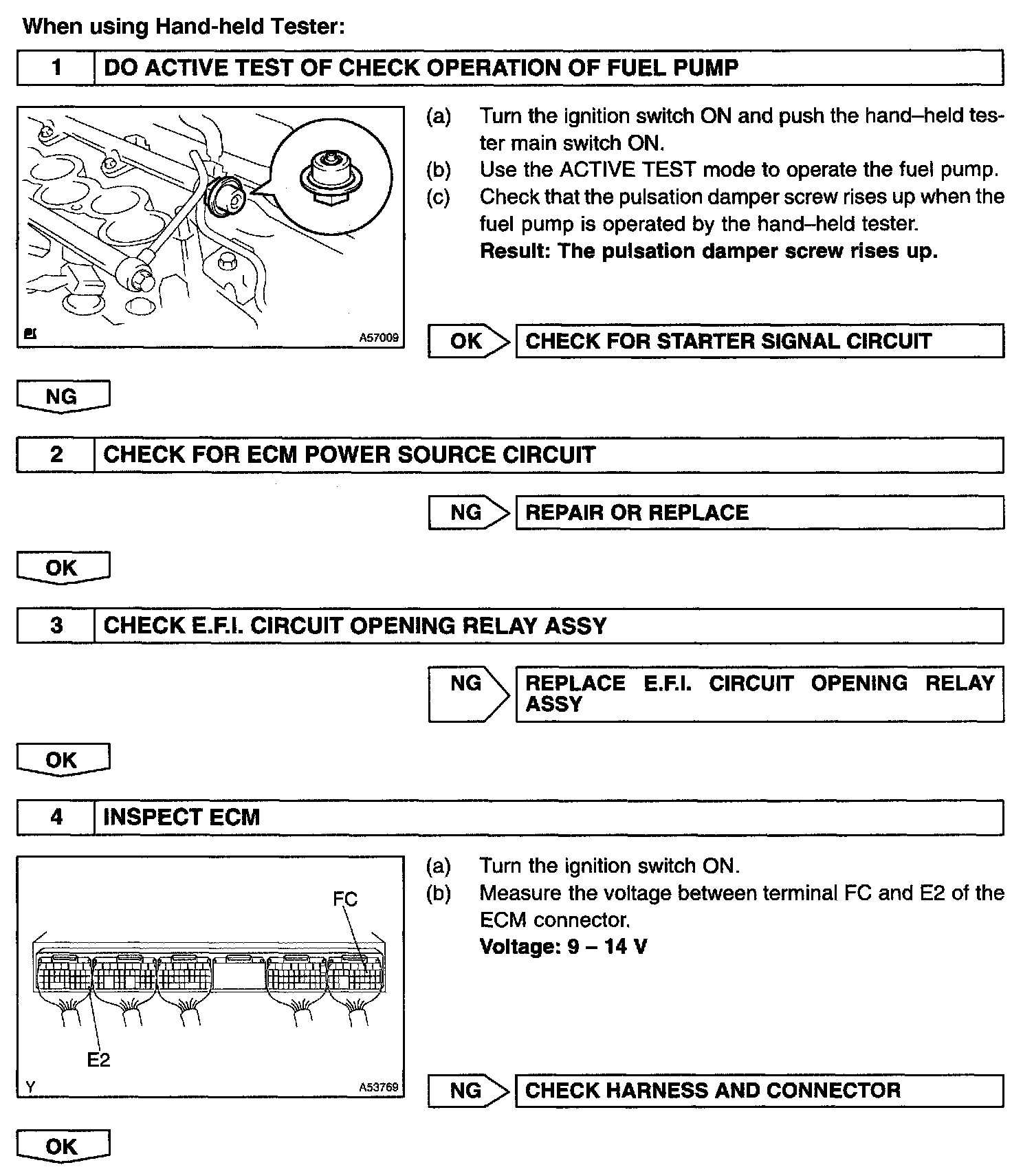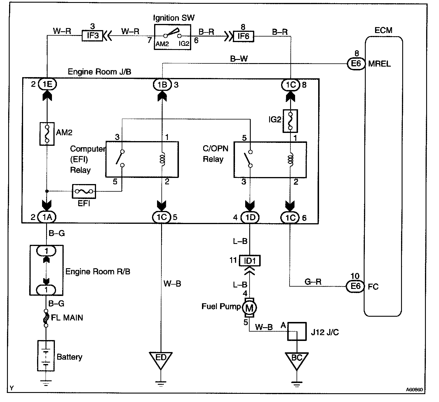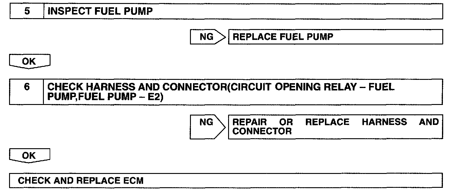 When the STA signal and NE signal are input to the ECM, Tr is turned ON, current flows to coil of the circuit opening relay (Marking: C/OPN), the relay switches on, power is supplied to the fuel pump and the fuel pump operates.