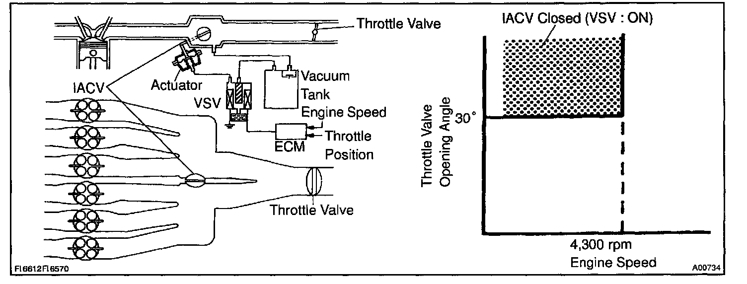When the engine speed is 4,300 rpm or less and the throttle valve opening angle is 30 ° or more, the ECM turns the VSV ON and closes the IACV. At all other times, the VSV is OFF, so the IACV is open.