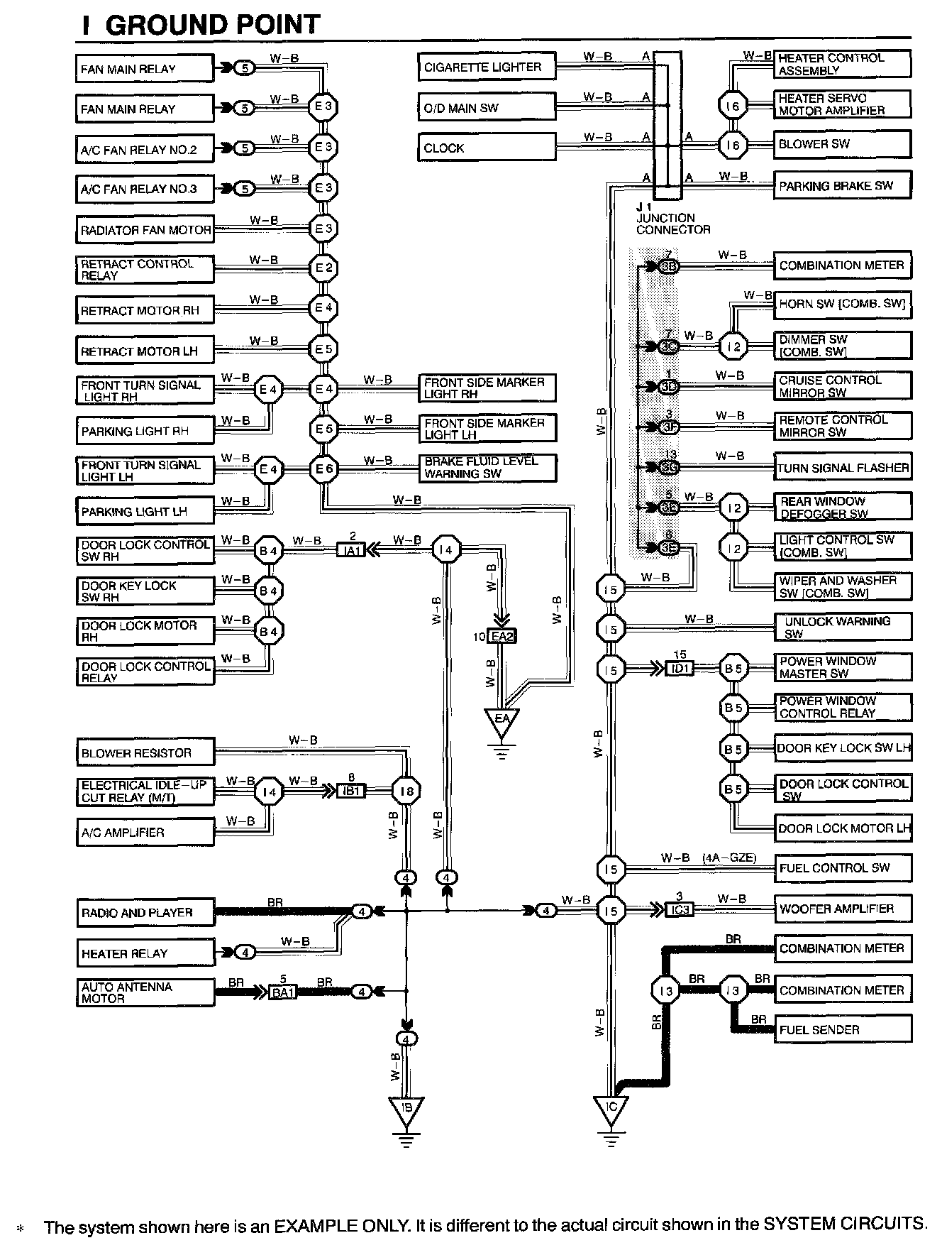 The ground points circuit diagram shows the connections from all major parts to the respective ground points. When troubleshooting a faulty ground point, checking the system circuits which use a common ground may help you identify the problem ground quickly. The relationship between ground points ([EA] , [IB] and [IC] shown) can also be checked this way.