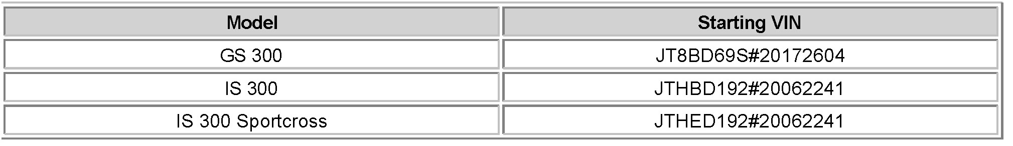 APPLICABLE VEHICLES: 2002 model year GS300 & IS300 equipped with automatic transmission produced BEFORE the VIN shown below.