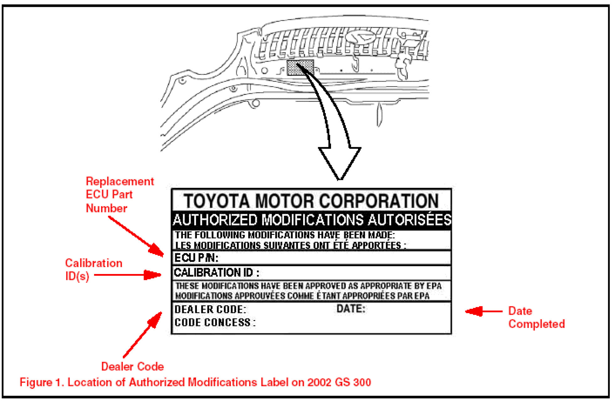 6. Check for the Authorized Modifications Label affixed to the vehicle in the location shown in Figure 1. Confirm if ECM (PCM) calibration has been updated. If not latest ECM (PCM) calibration - go to step 7.