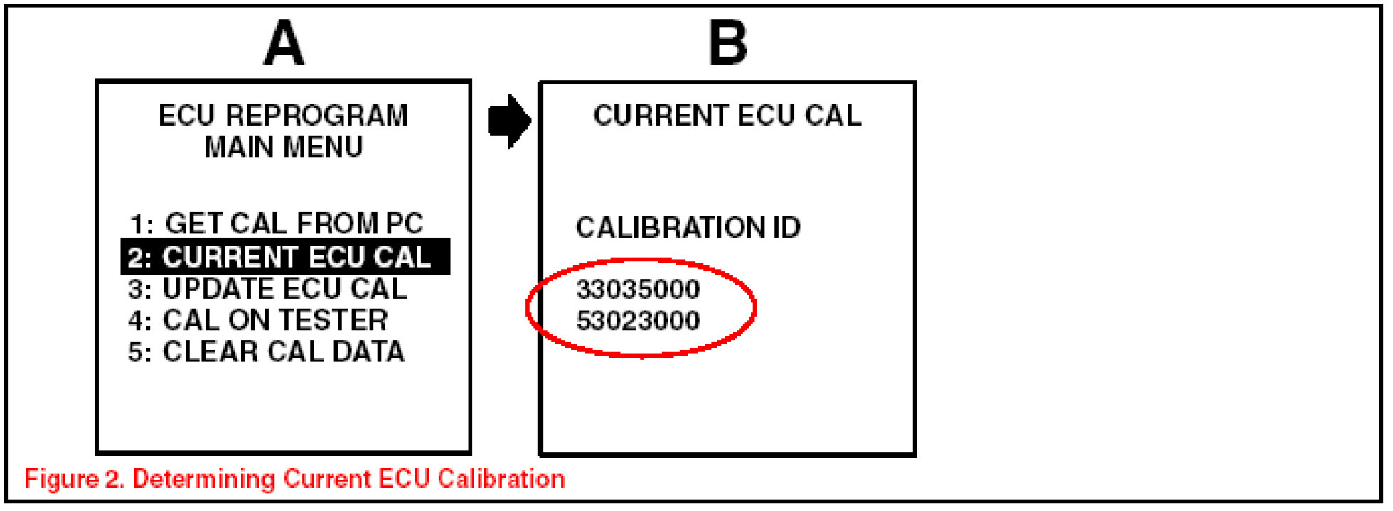 7. Connect the Diagnostic Tester to the vehicle and select CURRENT ECU CAL from the ECU REPROGRAM MAIN MENU. Determine the vehicle's current ECU calibration. (See Figure 2)