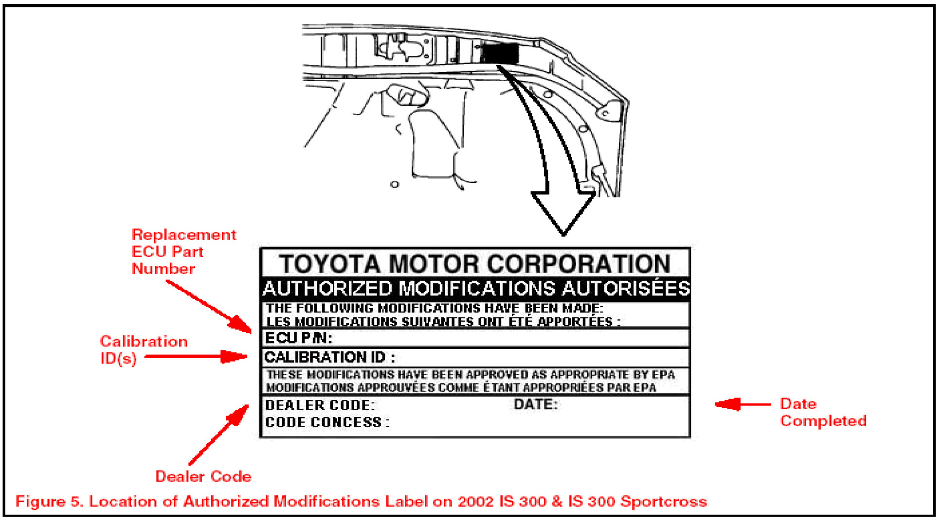 6. Check for the Authorized Modifications Label affixed to the vehicle in the location shown in Figure 5. Confirm if ECM calibration has been updated. If not latest ECM calibration - go to step 7.