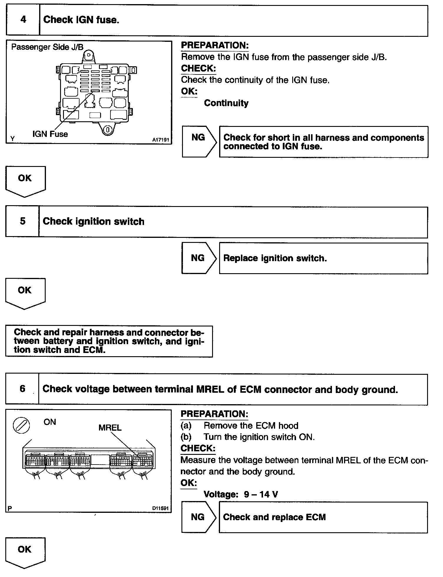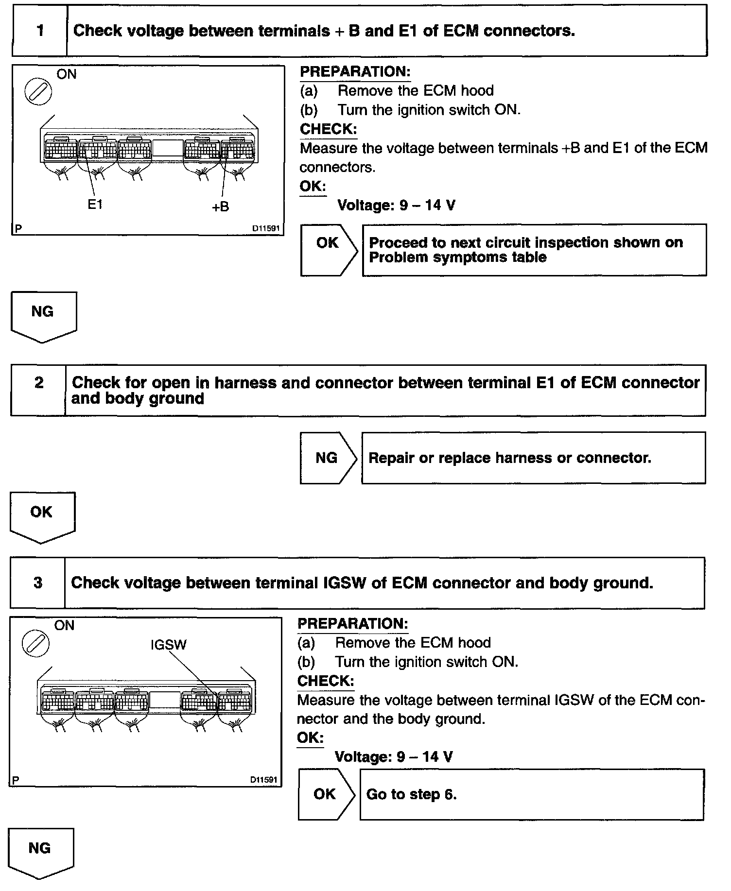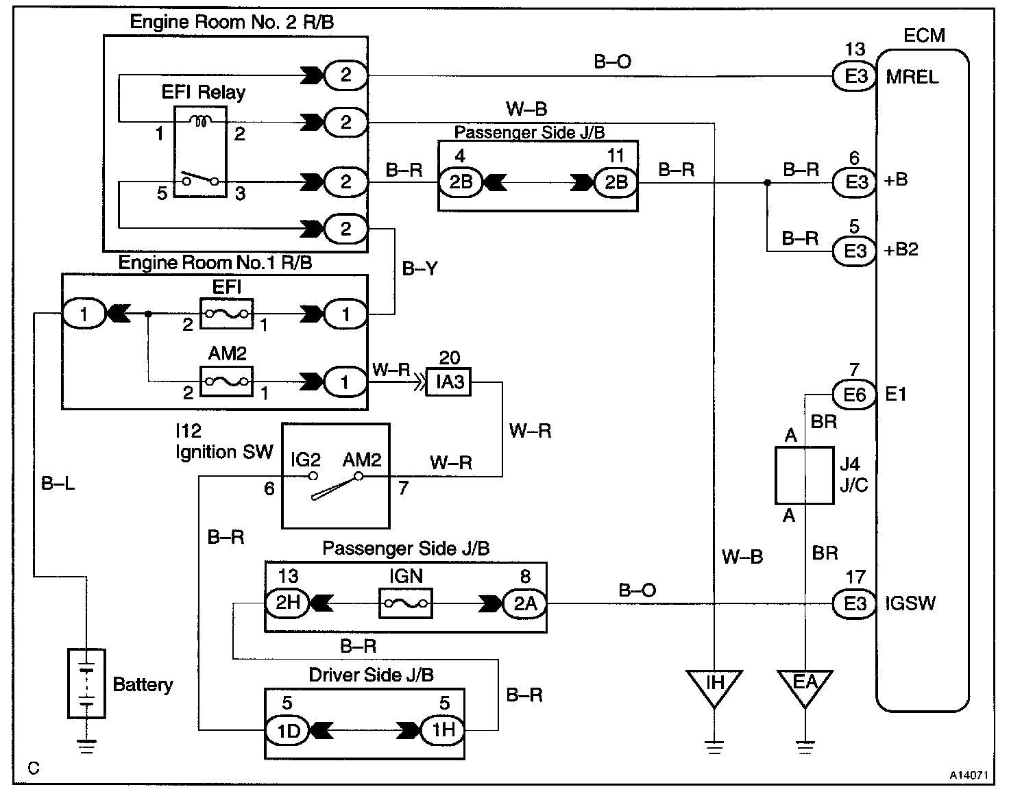 This signal causes current to flow to the coil, closing the contacts of the EFI main relay and supplying power to terminals +B and B2 of the ECM.