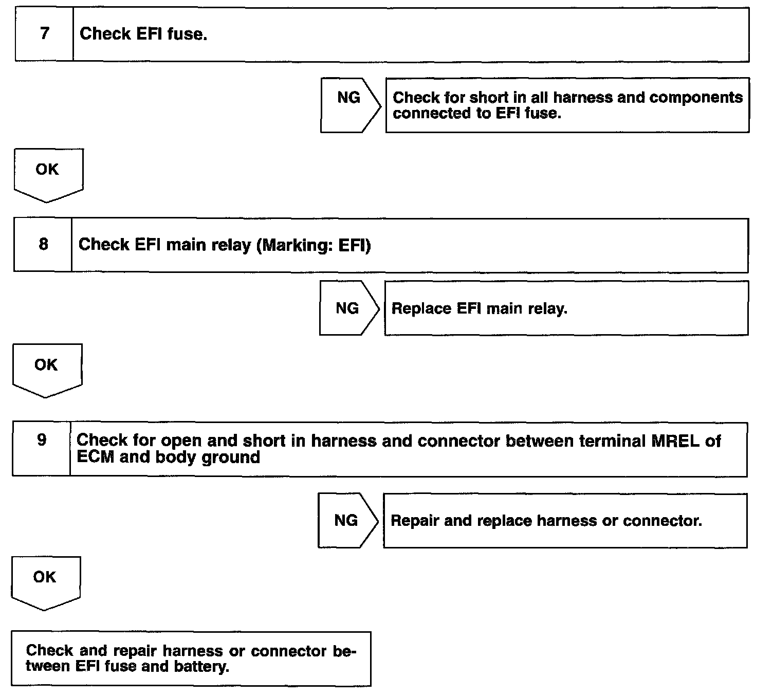 When the ignition switch is turned ON, battery positive voltage is applied to terminal IGSW of the ECM and the EFI main relay (Marking: EFI) control circuit in the ECM sends a signal to terminal MREL of the ECM, switching on the EFI main relay.