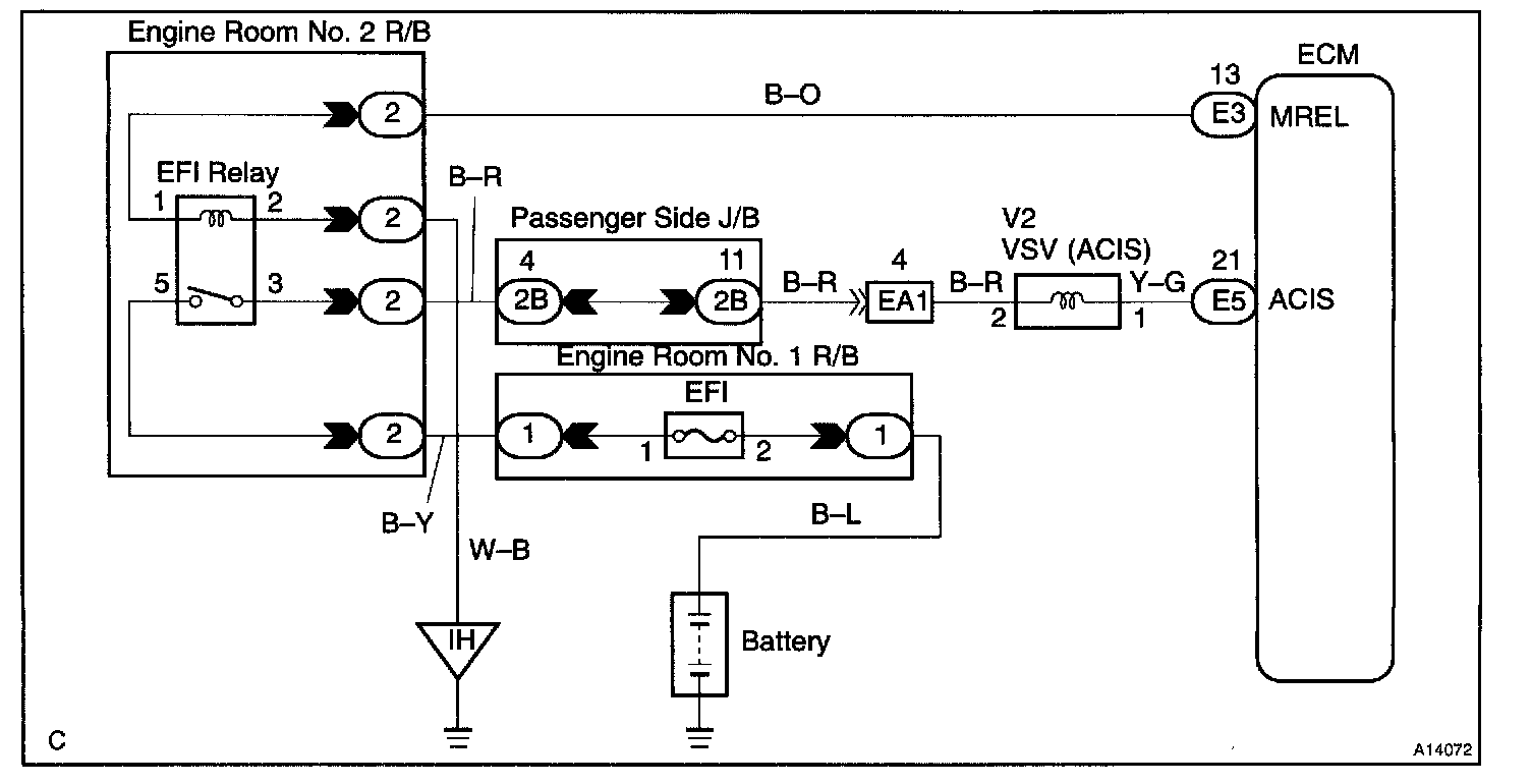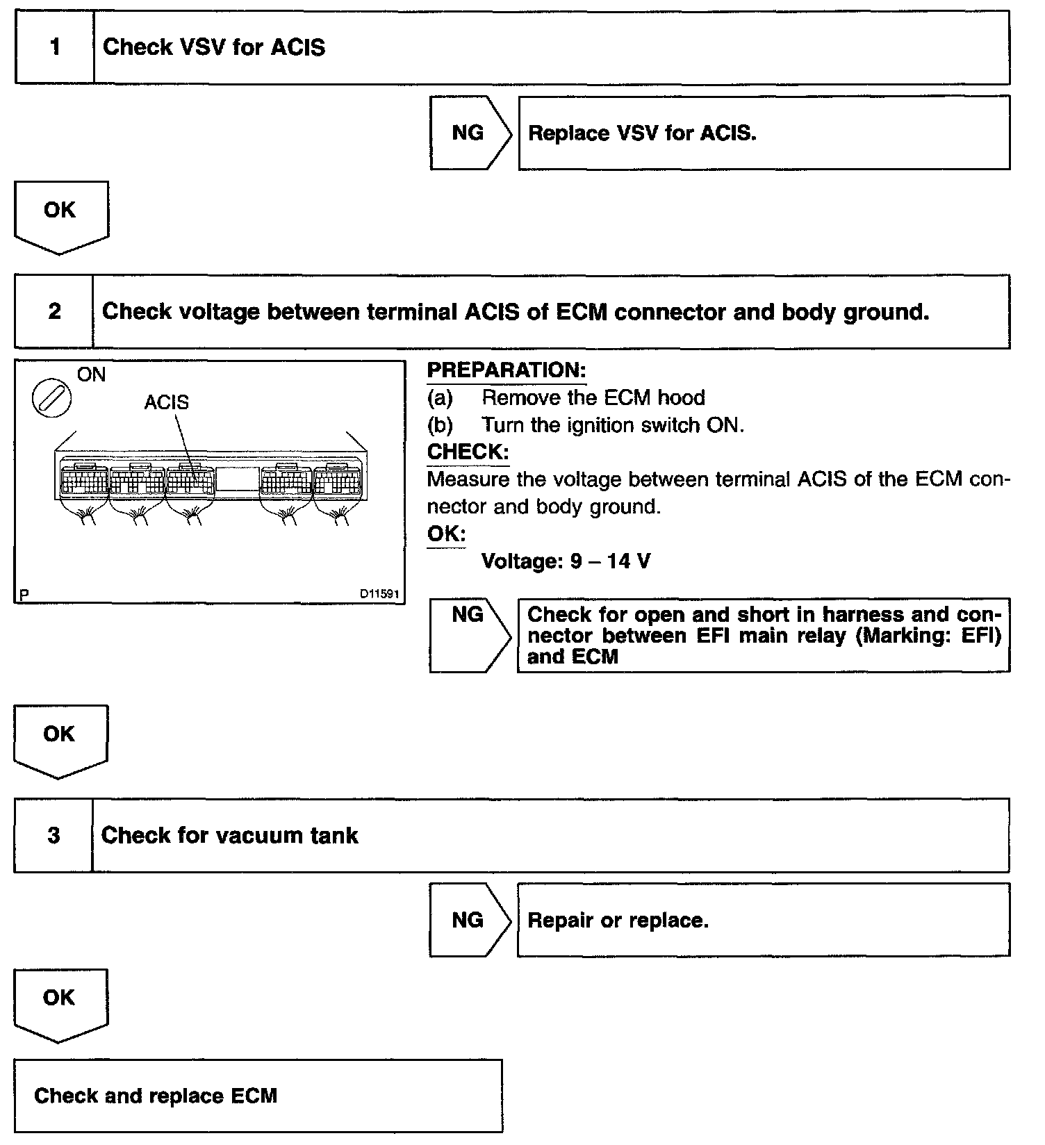 CIRCUIT DESCRIPTIONThis circuit opens and closes the Intake Air Control Valve (IACV) in response to the engine load in order to increase the intake efficiency (ACIS: Acoustic Control Induction System).