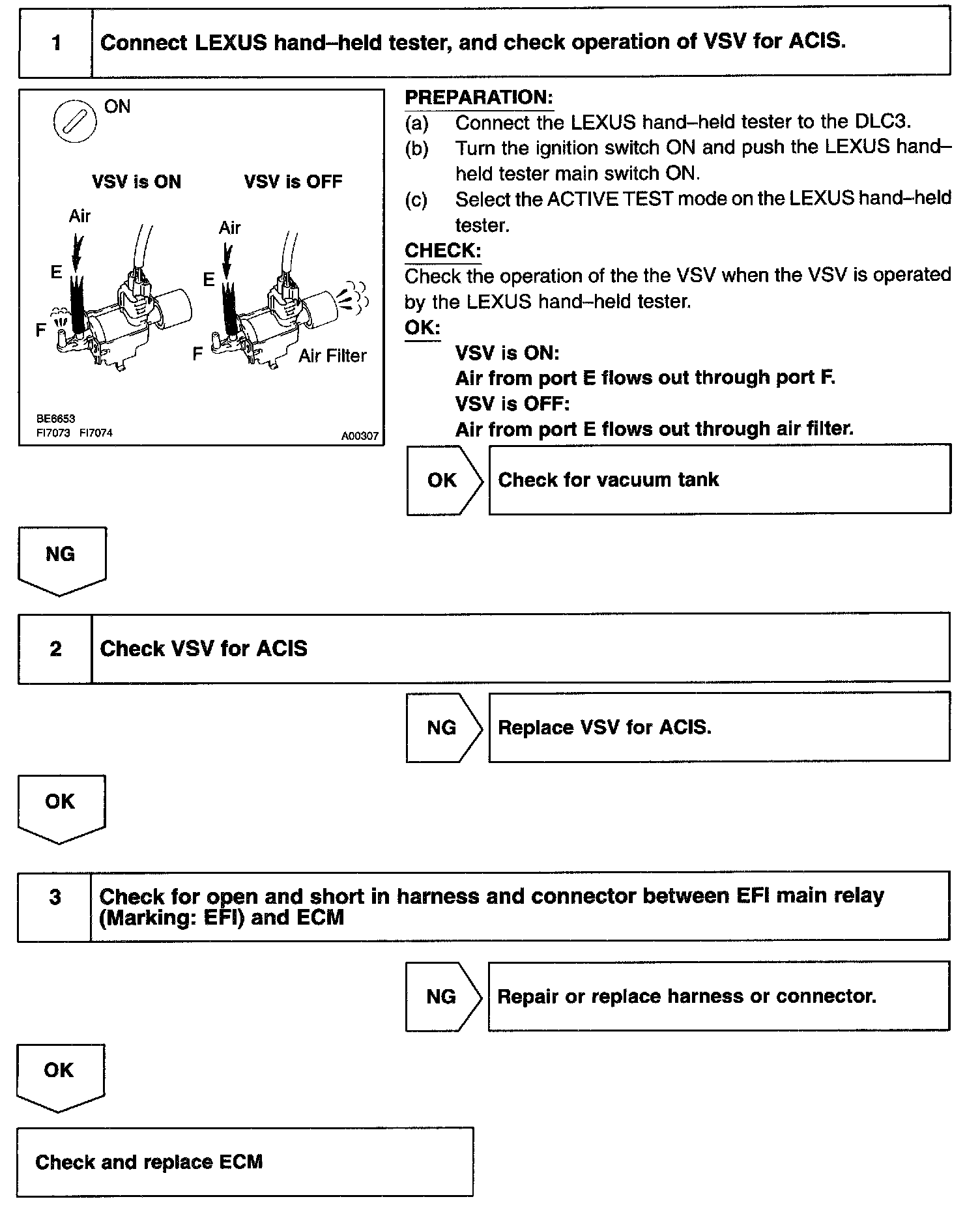 When the engine speed is 4,300 rpm or less and the throttle valve opening angle is 30 ° or more, the ECM turns the VSV on and closes the IACV. Usually, the VSV is OFF and therefore the IACV is open.