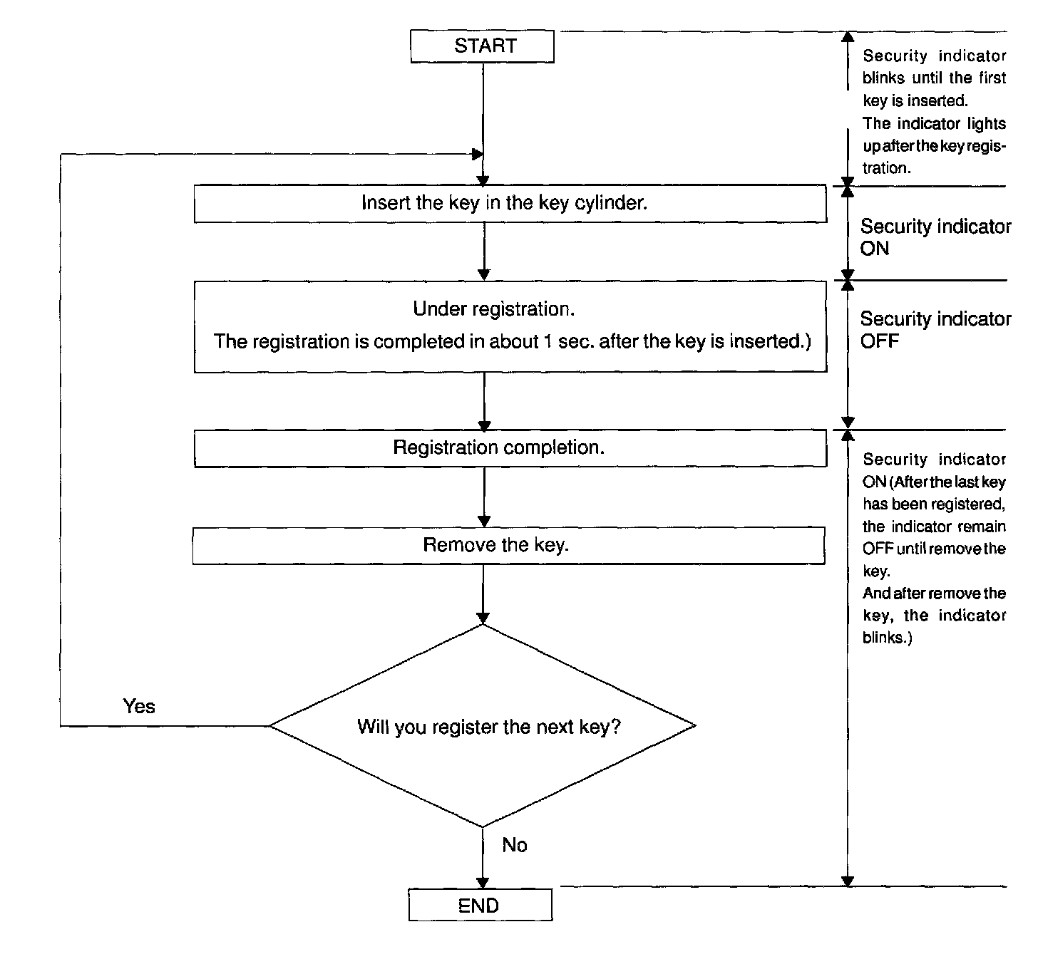 - When a key is not inserted in the key cylinder on the automatic registration mode, the security indicator always lights on.