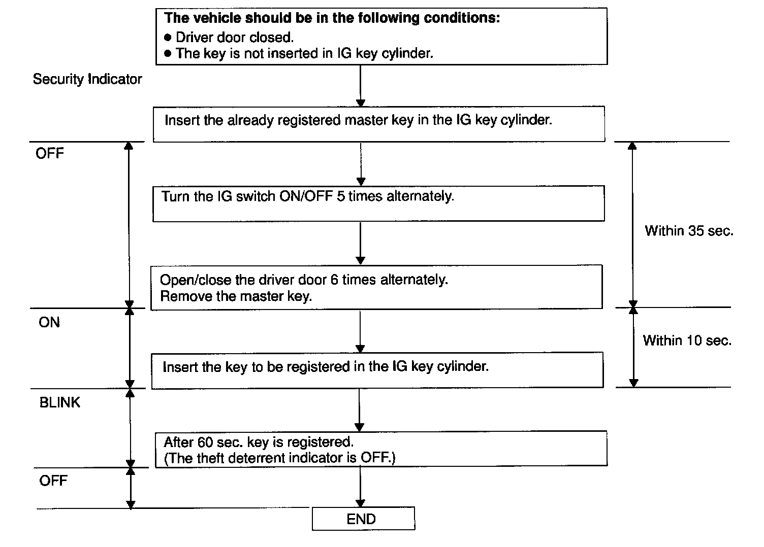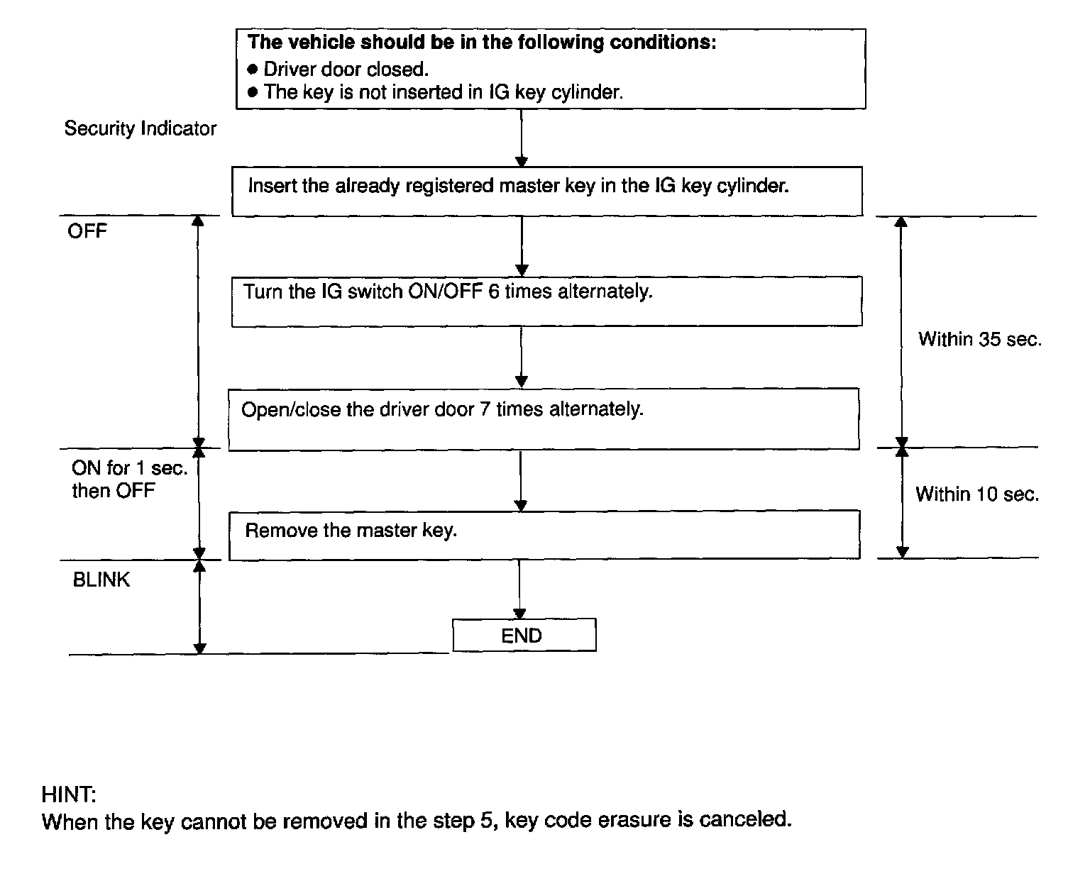 If completing the mode forcibly when more than 1 master key code have been registered on the automatic registration mode, perform the following operation using the already registered key. Turn the ignition switch ON/OFF alternately more than 5 times in 10 sec.