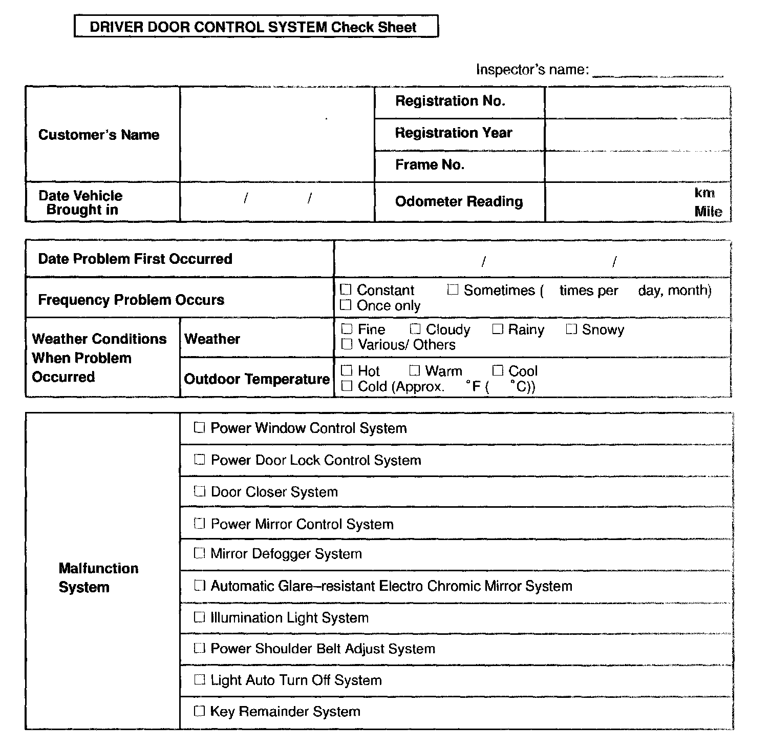 Driver Door Control System Check Sheet: