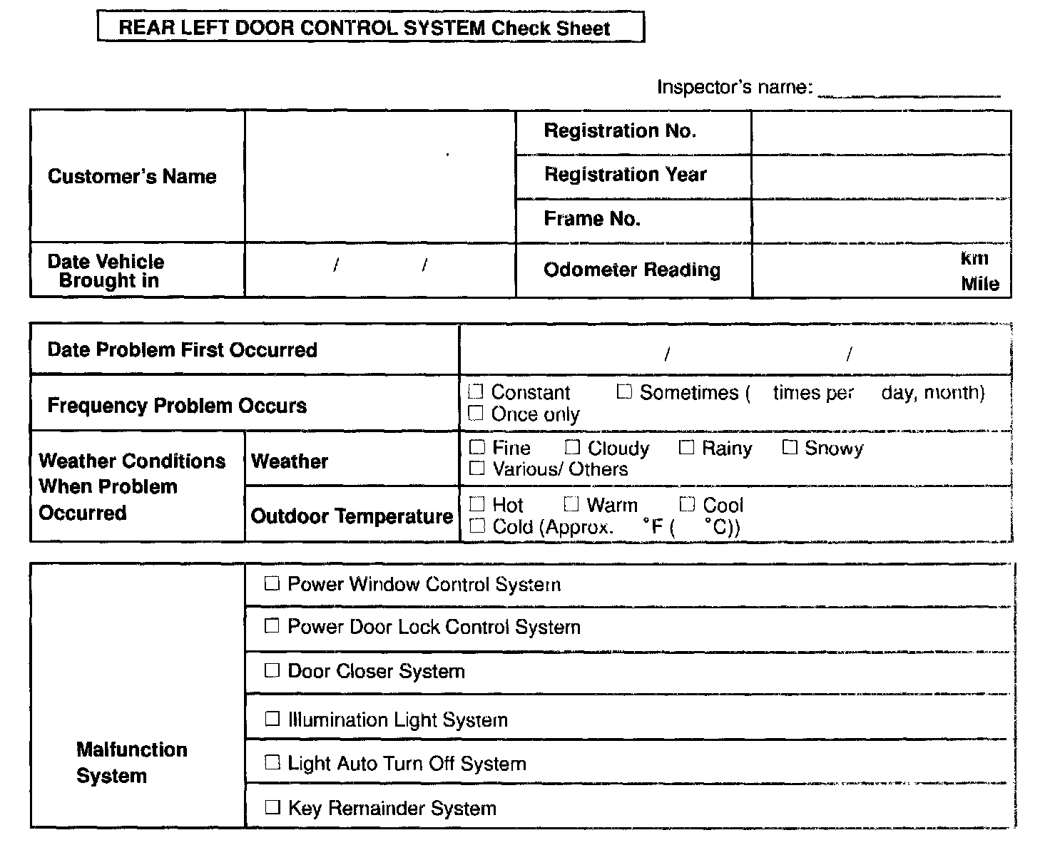 Rear Left Door Control System Check Sheet: