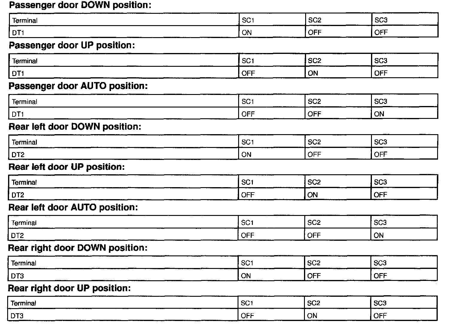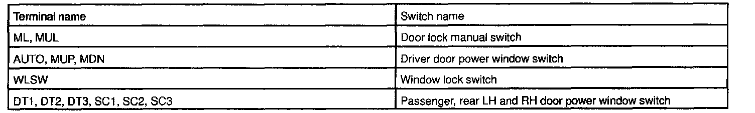 The Driver Door ECU distinguishes UP, DOWN and AUTO positions of the power window in the passenger and rear LH and RH door according to the combination matrix of terminals.