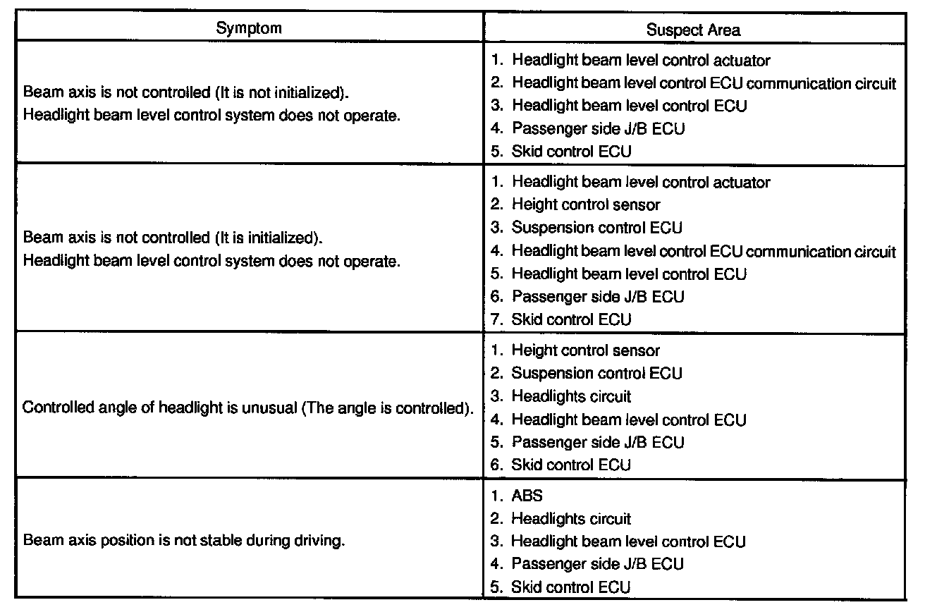 Problem Symptoms Table - Headlight Beam Level Control System: