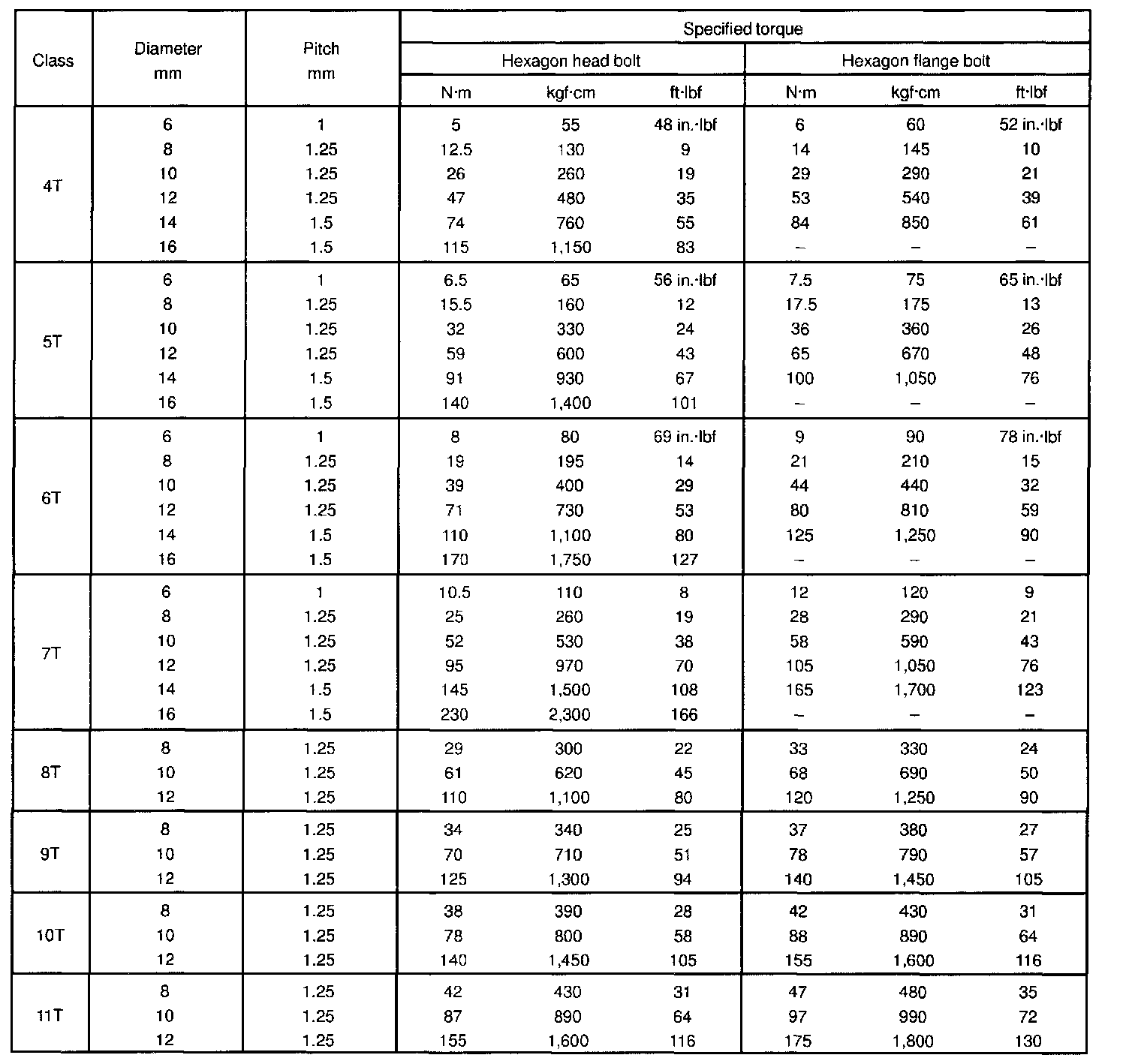 SPECIFIED TORQUE FOR STANDARD BOLTS