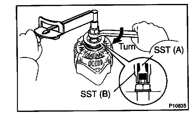 e. To loosen the pulley nut, turn SST (A) in the direction shown in the illustration.