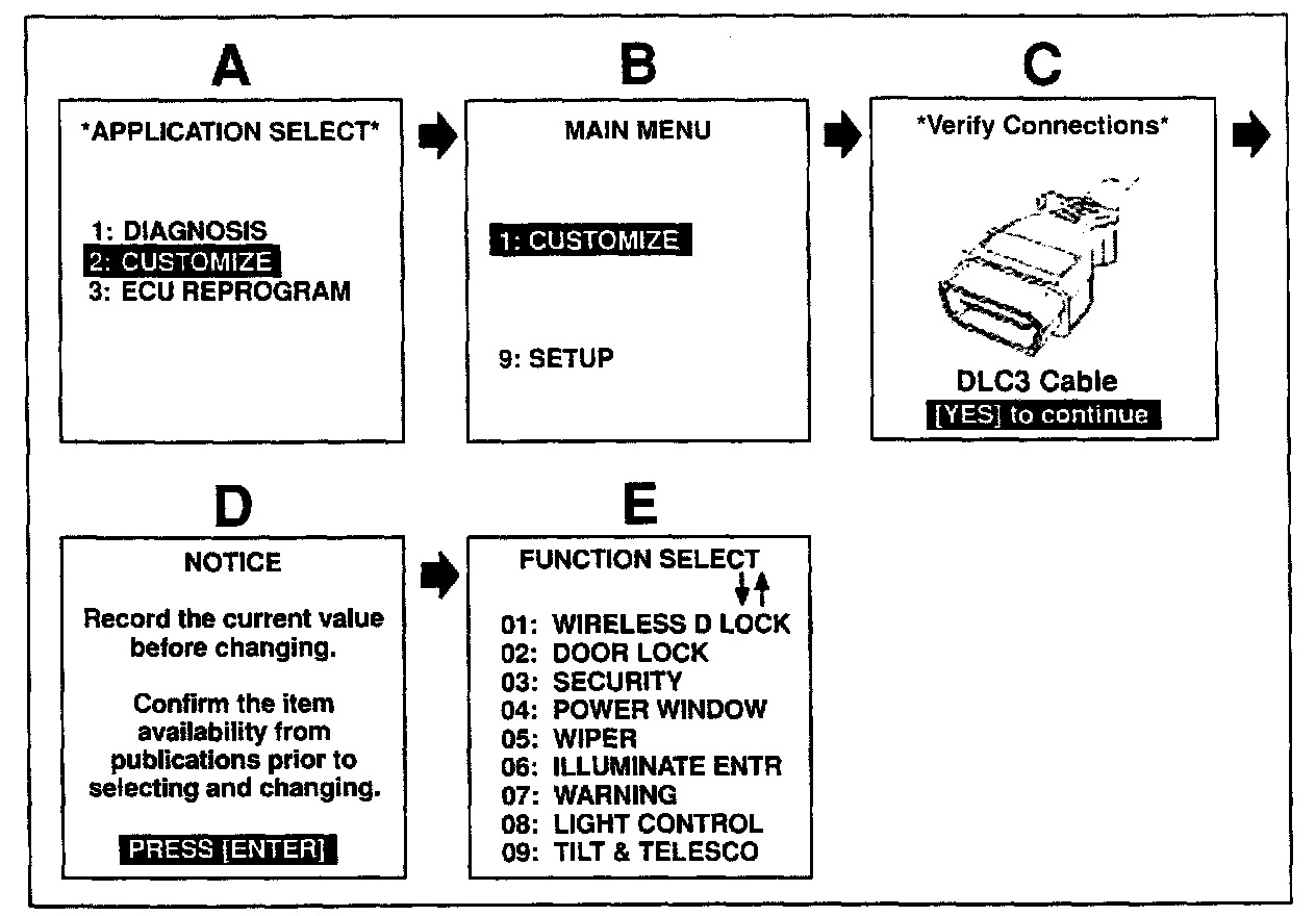 3. Using the Diagnostic Tester, follow the screen flow shown to access the customize function select menu.