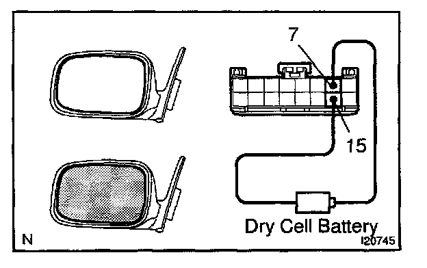 b. Connect the positive (+) lead from the dry through battery (1.5 V) to terminal 7 and the negative (-) lead to terminal 15, then check that the mirror surface becomes "dark".