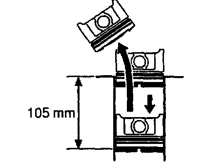 2. Using a piston, push the piston ring a little beyond the bottom of the ring travel, 105 mm (4.13 inch) from the top of the cylinder block.