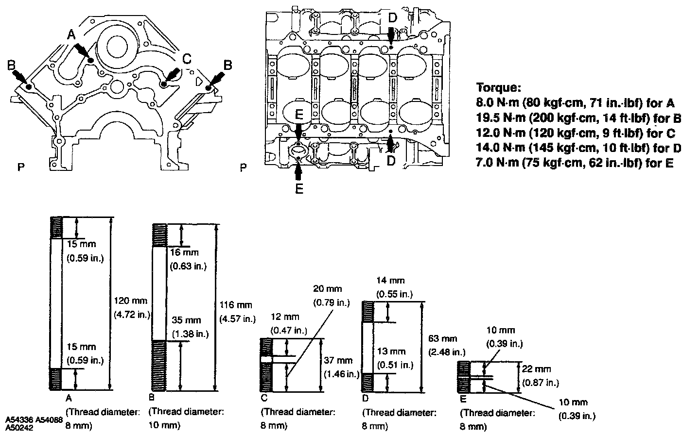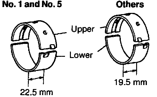 HINT: Main bearings come in widths of 19.5 mm (0.768 inch) and 22.5 mm (0.886 inch). Install the 22.5 mm (0.886 inch) bearings in the No. 1 and No. 5 cylinder block journal positions with the crankshaft bearing cap. Install the 19.5 mm (0.768 inch) bearings in the other positions. Upper bearings have an oil groove and oil holes; lower bearings do not.