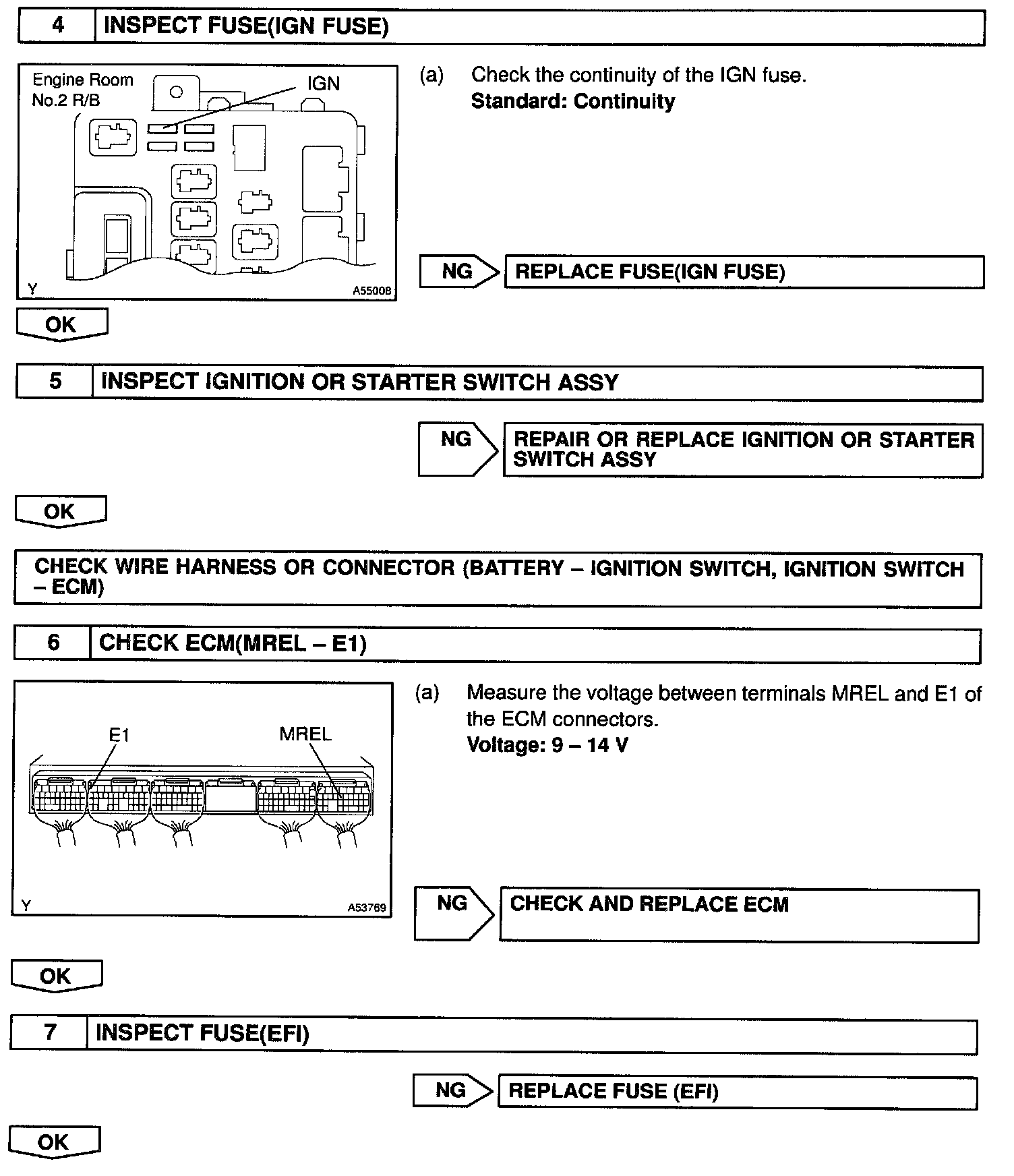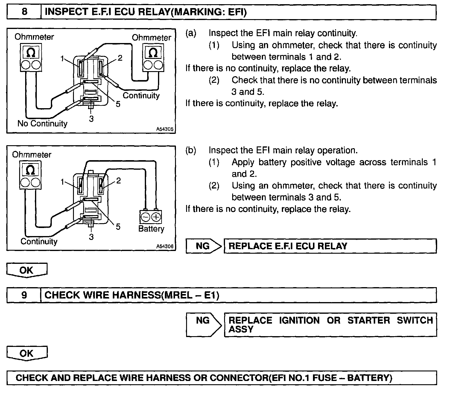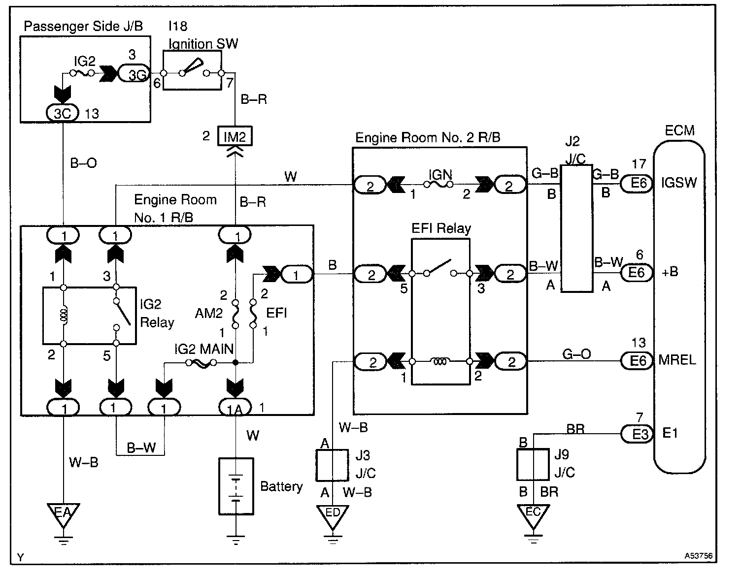 When the ignition switch is turned ON, battery positive voltage is applied to terminal IGSW of the ECM and the EFI main relay (Marking: EFI) control circuit in the ECM sends a signal to terminal MREL of the ECM switching on the EFI main relay.