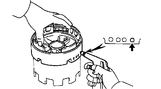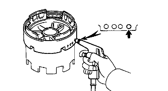 b. Apply compressed air (392 kPa, 4 kgf/cm2, 57 psi) into the oil passage as shown, and be sure that the O/D brake piston moves smoothly.