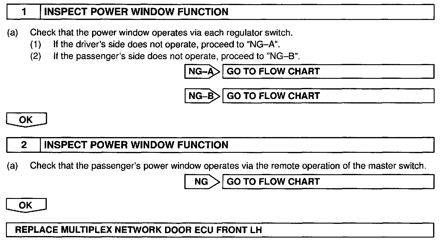 NOTE: Power window system has a function with a large-scale body multiplex communications. First of all, inspect the communication function depending on the "how to proceed with troubleshooting", and check there is no abnormality in the communication system. Then finally proceed with the troubleshooting. Also, if the power window system has a malfunction in the jam protection function, the AUTO operations are prohibited. Because of this, confirm the diagnosis code is normal before the troubleshooting.