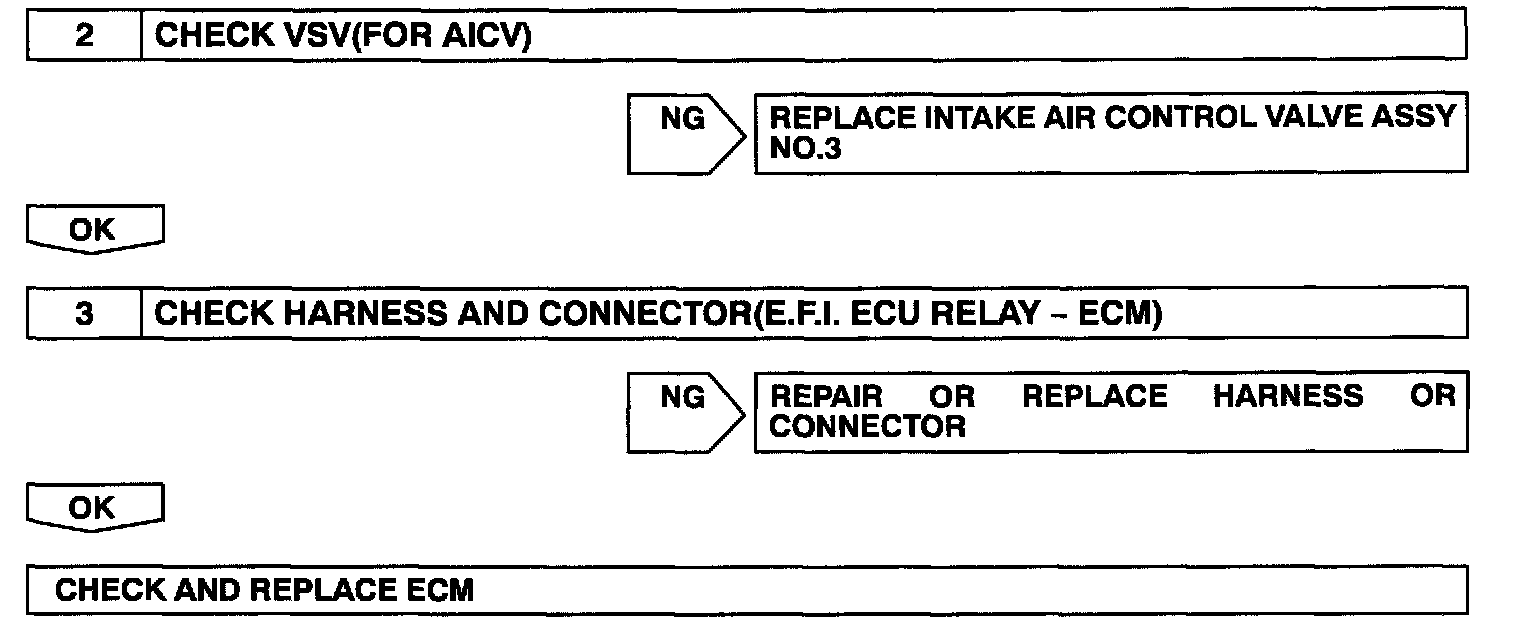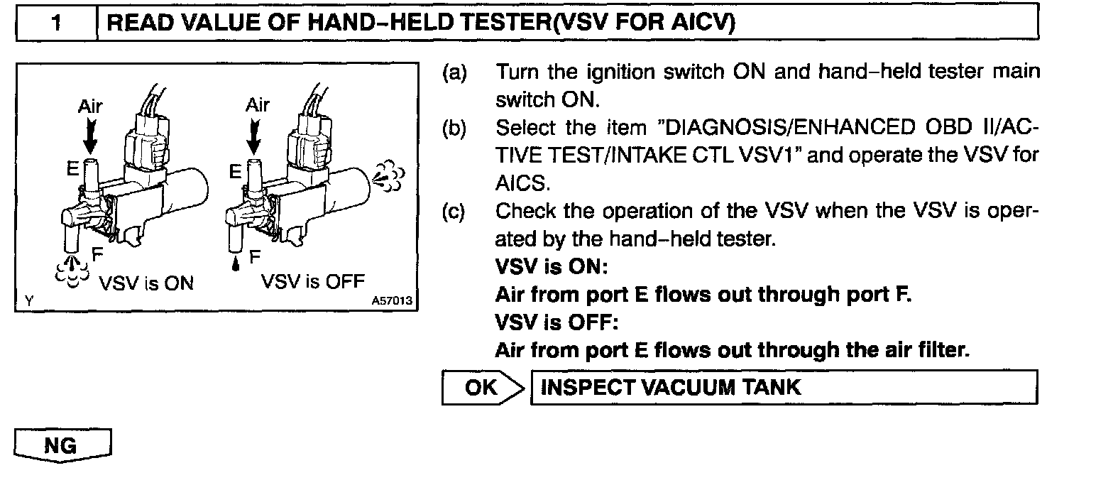When the engine speed is more than 3600 rpm and the opening of the throttle valve is more than 30°, the ECM activates VSV ON and operates AICV.