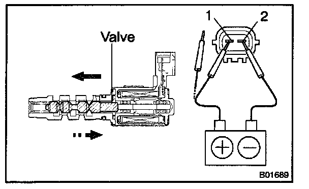 1. Connect the positive (+) lead from the battery to terminal 1 and negative (-) lead to terminal 2, and check the movement of the valve.