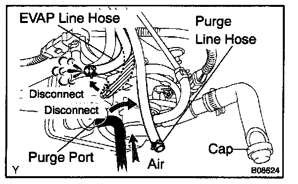 a. Disconnect the purge line hose and EVAP line hose from the charcoal canister.