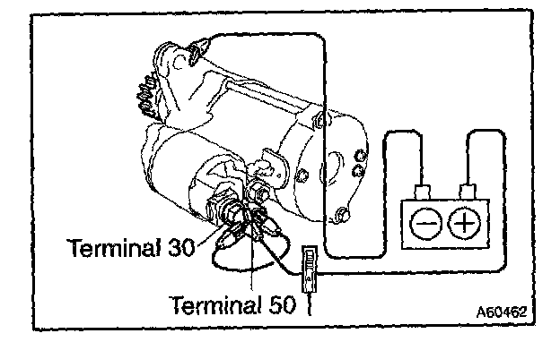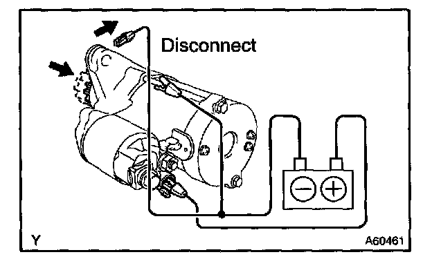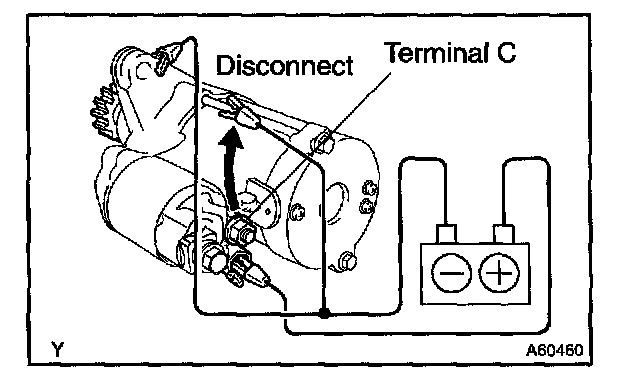 c. With battery connected as above with the clutch pinion gear out, disconnect the negative (-) lead from terminal C. Check that the pinion gear remains out.