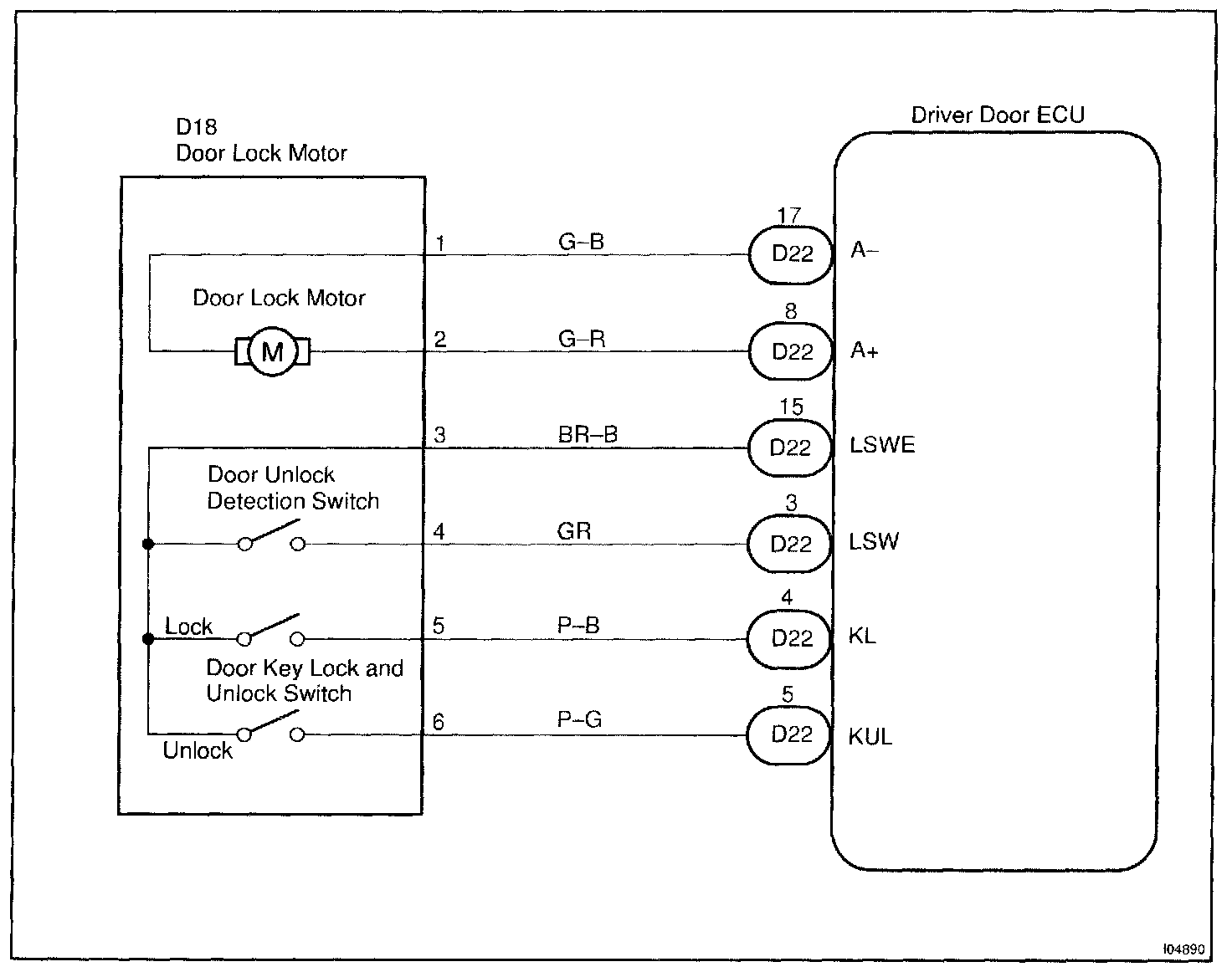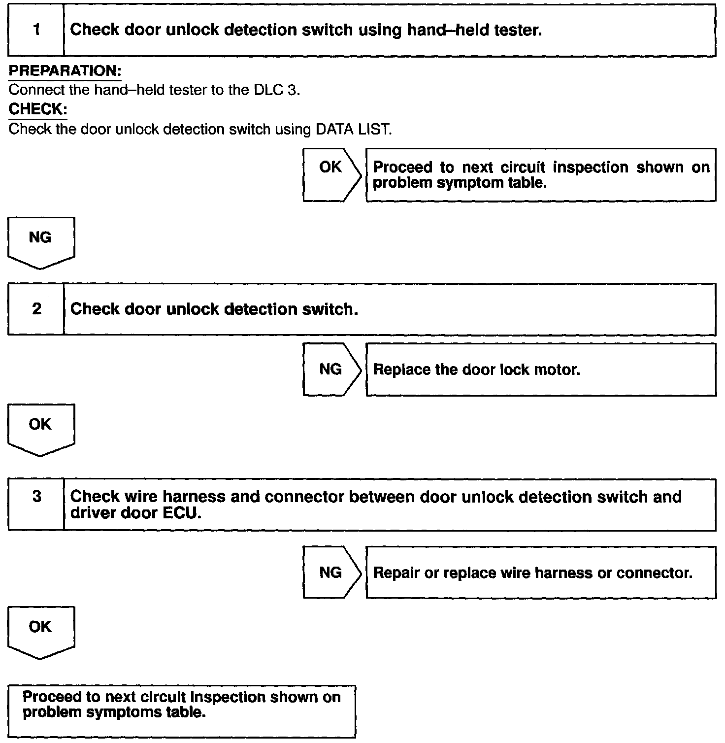 CIRCUIT DESCRIPTIONThe door unlock detection switch is built in the door lock motor assembly. This switch is ON when the door lock knob is in the unlock position and OFF when the lock knob is in the lock position. The ECU detects the door lock knob conditions is this circuit. It is used as one of the operating conditions for the key confinement prevention function.