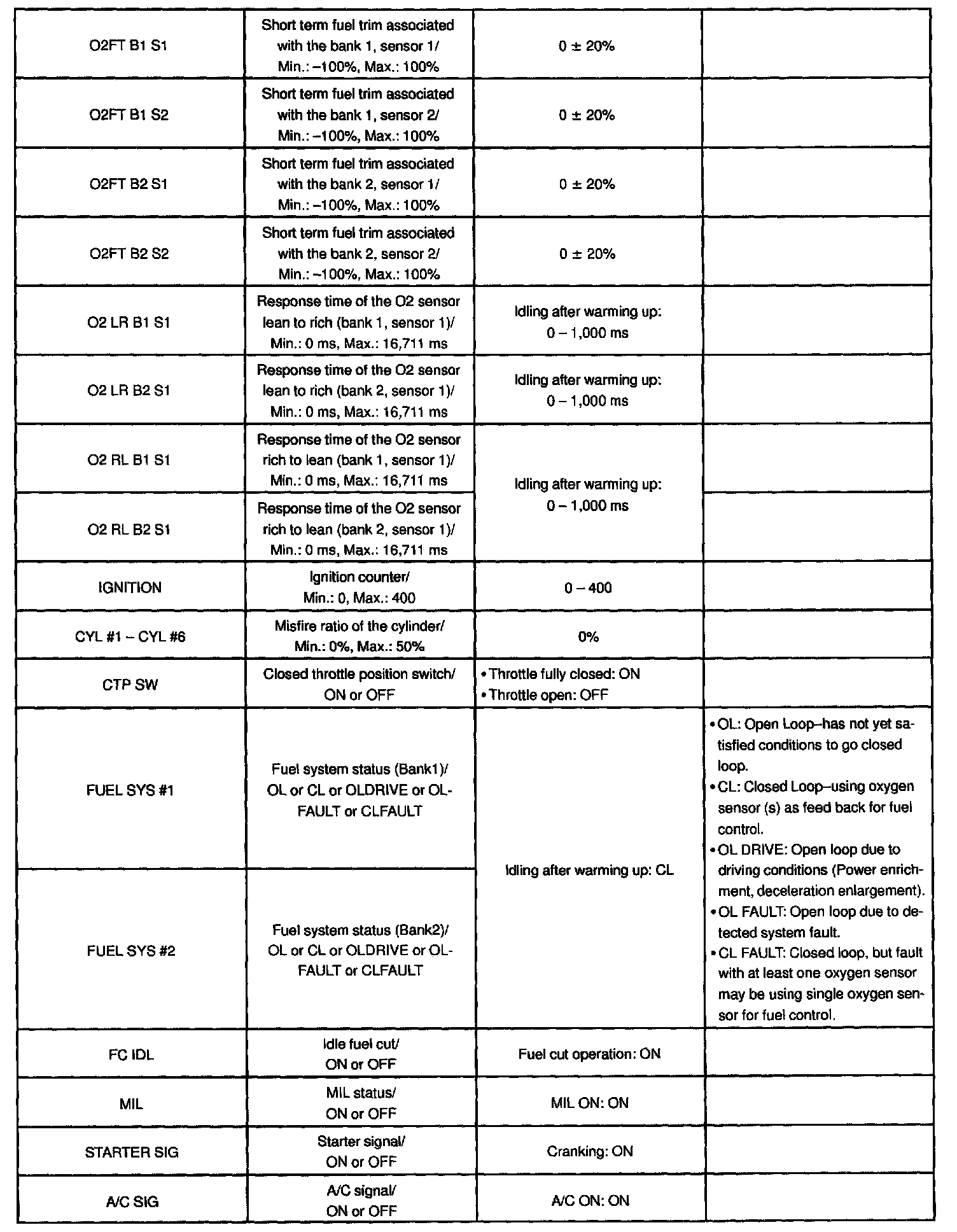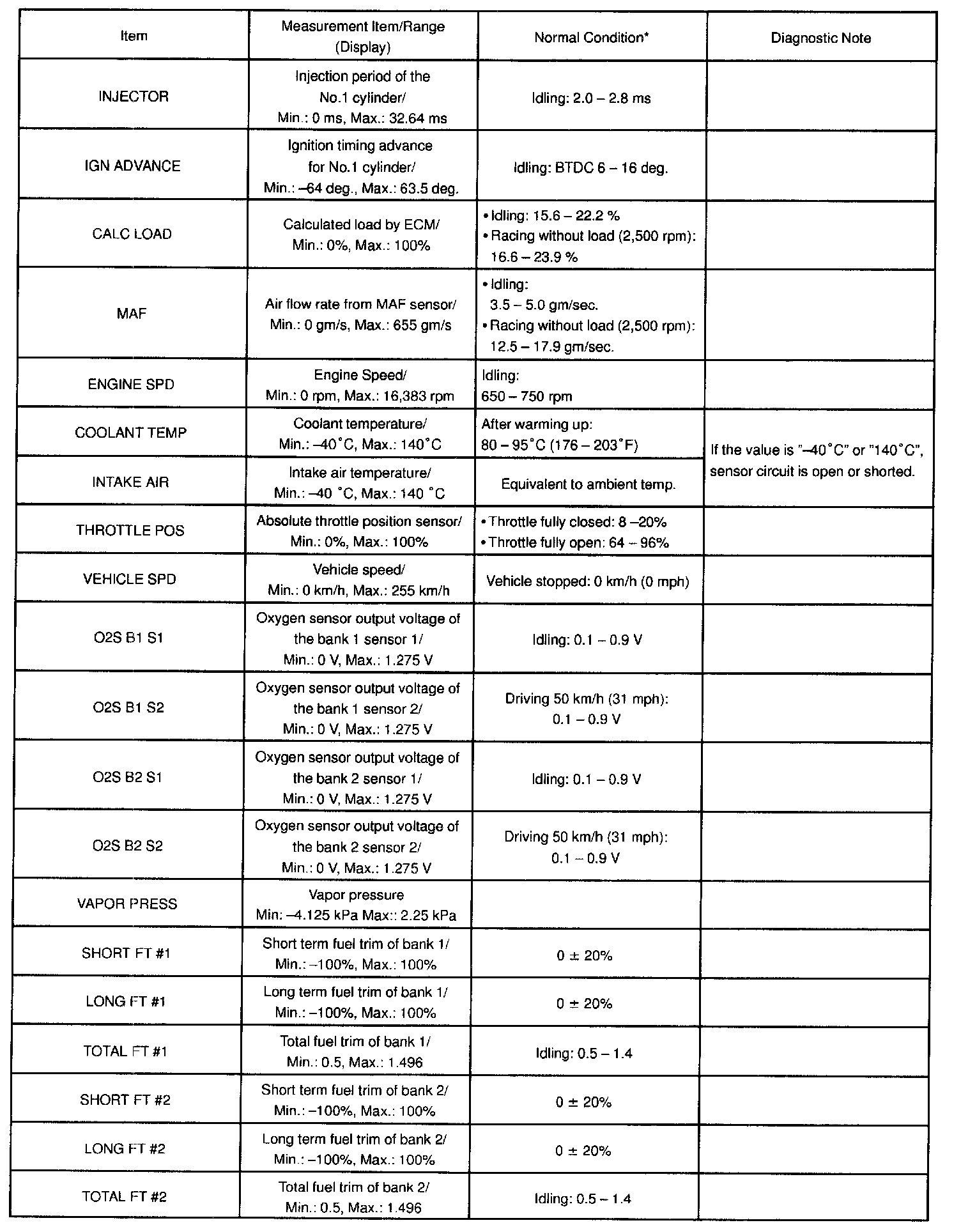 NOTE: The values given for "Normal Condition" are representative values. So, a vehicle may still be normal even if its value differs from those listed here. So, do not solely depend on the "Normal Condition" here when deciding whether a part is faulty or not.