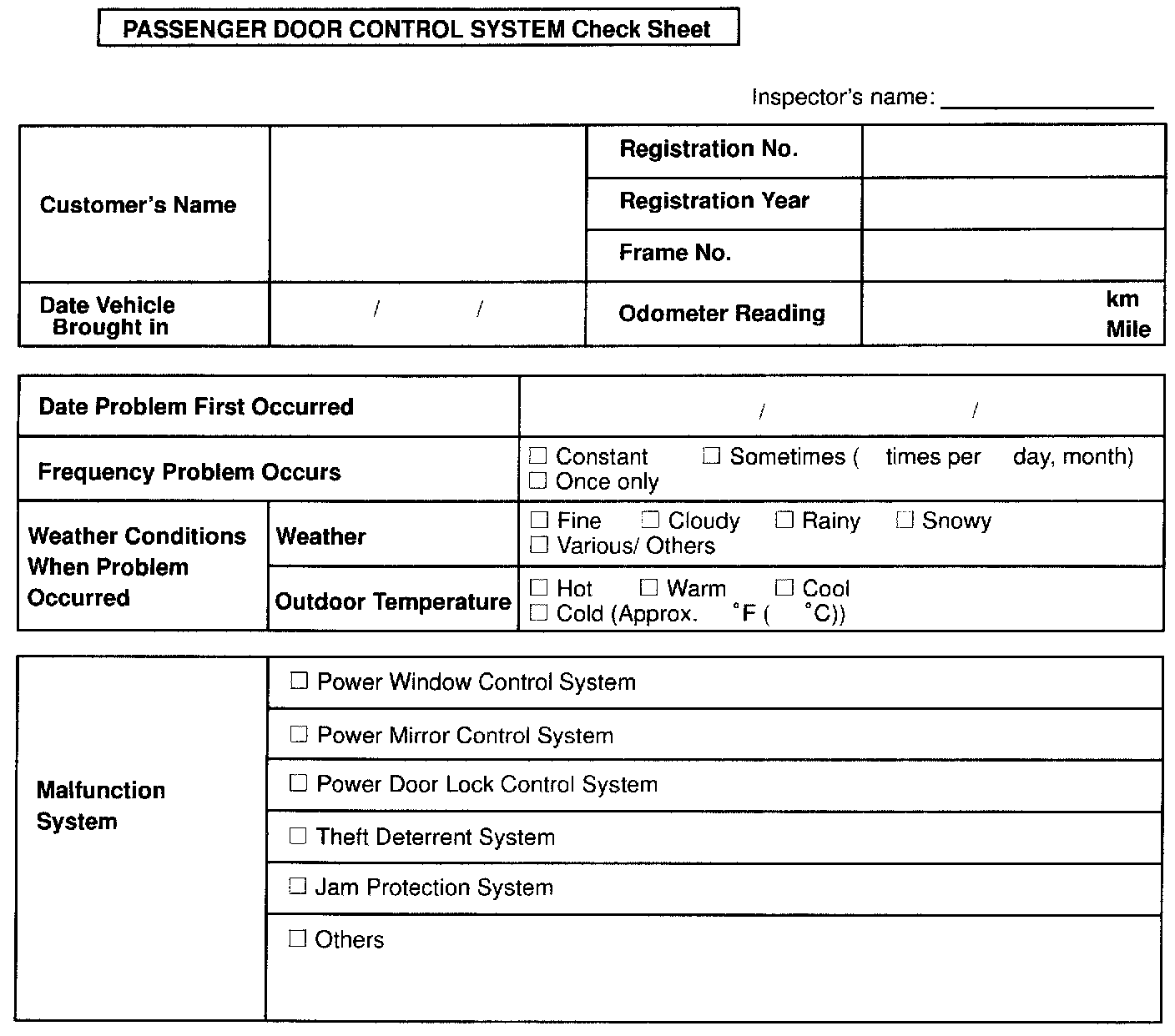 Passenger Door Control System Check Sheet: